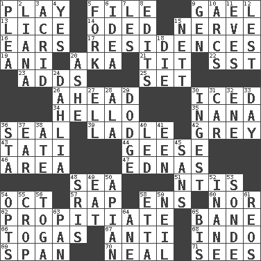 ACROSS 1. Romp 5. Do some clerical work 9. Highlander 13. Louse (plural) 14. Wrote a lyric poem 15. Impudent aggressiveness 16. Hearing organs 17. Dwellings 19. Black tropical American cuckoo 20. Alias (abbr.) 21. Teat (slang) 22. Fast jet (abbr.) 23. Sums up 25. Put into a specified state 26. At or in the front 30. On the rocks 34. Phone greeting 35. Nanny 36. Lick closed 39. Dipping utensil 42. Jennifer or Joel 43. Jacques of French films 44. Honkers 46. Length times width 47. Ferber et al. 48. Ocean 51. Nuclear Threat Initiatives 54. Sep. follower 57. Reproach for some lapse or misdeed 58. Followers of ems 60. And not 62. Appease 65. Object of repulsion 66. Ancient Roman robes 67. Opposed to 68. _ china 69. Connect, as a bridge 70. Anneal 71. Perceives with the eye DOWN 1. Entreaty 2. Climbing, woody, usually tropical vines 3. Sour-tasting 4. It is so 5. Tined utensil 6. It may be bright or harebrained 7. French article 8. Proofreads 9. Commissioned mil. rank 10. Arches 11. Nights before holidays 12. For fear that 15. Remaining after all deductions 18. Pass on 20. American tennis player Robert 24. A pale violet or amethyst color 27. Pipe bend 28. Insect wing 29. Evade 30. Consume 31. 4-wheeled motor vehicle 32. Compass dir. 33. 24 hours 36. R.R. building 37. Hearing organ 38. Had dinner 40. Directed 41. Car or cant ending 45. Without 48. Indian titles of respect 49. Erode 50. Bee-related 52. Silly 53. Message 54. Elects 55. Riding implement 56. Ancient Roman robe 58. Singer James 59. Famous astronaut Armstrong 61. Vintage cars 63. Baking dish 64. A saturated hydrocarbon 65. Twice