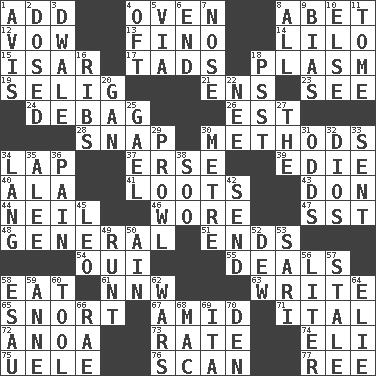 ACROSS 1. Find the sum of 4. Baking chamber 8. Collude with 12. Promise 13. Fine (Spanish) 14. _ and Stitch 15. Austrian river, tributary to the Danube 17. Small boys 18. Suffix with ecto or cyto 19. Former Milwaukee Brewers owner Bud 21. Followers of ems 23. Perceive with the eye 24. Debunk (Brit. slang) 26. Eastern Standard Time (abbr.) 28. Fastener 30. Modes 34. Pet locale 37. Celtic language 39. Singer Brickell 40. Wing 41. Plunders 43. Spanish title 44. Famous astronaut Armstrong 46. Had on 47. Fast jet (abbr.) 48. Commissioned military rank 51. Extremities 54. Fr. "Yes" 55. Allots cards 58. Consume 61. Compass dir. 63. Compose 65. Derisive sound 67. Among 71. Slanted text style (abbr.) 72. Small Philippine buffalo 73. Pace 74. Biblical high priest 75. Ubangi River tributary 76. Examine hastily 77. To riddle DOWN 1. Advice 2. Administered medicine 3. A sleeping potion; an opiate (poet.) 4. Often (poetically) 5. By way of 6. Conclusion 7. Olfactory organ 8. 100% 9. Prejudice 10. Otherwise 11. Heavy book 16. Chest bones 18. Inconspicuous attention getter 20. Separate the seeds from cotton 22. Born 25. Highlander 27. Definite Article 29. Move like a hungry wolf 30. Distance measurement (Brit.) 31. Likelihood 32. "Vaya con ____" 33. Emitted 34. Austrian-born American filmmaker Fritz 35. Toward shelter 36. Ache 38. "Barney Miller" actor Jack 42. Post 45. Lion 49. The smallest animal of a litter 50. The 18th letter of the Arabic alphabet 52. Morning condensation 53. Indian skirt 56. 61 cubic inches 57. Showing deterioration from age 58. Son of Isaac 59. Queen of England 1702-14 60. Utensil 62. Armed conflicts 64. Writer Wiesel 66. Actress Charlotte 68. Apple computer (short form) 69. Call ___ day 70. Lair