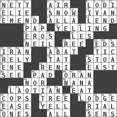 ACROSS 1. Remaining after all deductions 5. Atmosphere 8. Farming town in central California 12. Writer Wiesel 13. Overwhelm 15. "Terrible" tsar 16. Make improvements or corrections to 18. Silent film actress Nazimova 19. Grant temporary use of 20. Infant food 22. Crying or shouting loudly 24. Greek god of love 26. French article 27. Famous astronaut Armstrong 28. To separate or throw off 29. Begley and Asner 32. SW Asia republic 35. Blind as ____ 37. Nervous spasm 38. Have trust in 39. Make lace 40. Portico 41. Compass dir. 42. Painter Guido (1575-1642) 43. 90 degrees 44. Perceive with the eye 45. Groovy apt. 46. Northwest Algerian city 49. Or not 50. Nanny 51. Of or relating to Laos or its people 55. Erode 56. 911 reaches them 57. Family _ (genealogy) 59. Inn 63. Relaxation 64. Shout 65. Monetary unit of Yemen 66. Singles 67. Everything 68. Elected reps. DOWN 1. Born 2. Shade tree 3. Neckwear 4. 3-inch nail 5. White ___ sheet 6. Inwardly 7. Hero or heavy, e.g. 8. Ms. Damita and namesakes 9. Baking chamber 10. Mild oath, euphamism for damn 11. Indiana (abbr.) 14. Place for singles 17. Have the gumption 21. Luau course 23. Area sheltered from the wind 25. Scheduled 28. Food allowance for one day 29. Singer James 30. "Vaya con ____" 31. Scram, to a cat 32. Angers 33. French philosopher Descartes 34. Toward shelter 36. Forbid 40. Elected representatives 42. Noteworthy scarcity 45. Plant holder 47. Actress Charlotte 48. Of or related to the anus 49. Olfactory organs 51. Grant temporary use of 52. Domed church section 53. Length times width 54. 1994 drama film starring Jodie Foster 56. Corporate head (abbr.) 58. Pipe bend 60. Expire 61. Separate the seeds from cotton 62. Raised railways