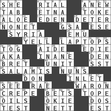 ACROSS 1. A female animal or person 4. Monetary unit of Yemen 8. Afresh 12. Bar bill 13. Inactive volcano in Sicily 14. Casino tip 15. Medicinal plant 17. Paradise 18. Prevent from occurring 19. Music written for nine 21. Girls' org. (abbr.) 23. Compass dir. 24. Damascus' land 26. Australian flightless bird 28. Shout 30. Portable computers 34. Coat; cloak 37. Assistant 39. Singer Brickell 40. Alias (abbr.) 41. Silly 43. Lair 44. Cy Young winner Saberhagen 46. A single undivided whole 47. Fast jet (abbr.) 48. Deli grouping 51. Religious women 54. Spanish title 55. An arm off of a larger body of water 58. Observe 61. Actress Charlotte 63. Make _____ (do battle with) 65. Streamer paper 67. Antes 71. Drink excessively 72. Petroleums 73. Migrant worker of the '30s 74. Two (Sp.) 75. Trial 76. Remaining after all deductions 77. Eastern Standard Time (abbr.) DOWN 1. Comedian Laurel of Laurel & Hardy 2. Rings 3. Black 4. To sift 5. It would 6. One (Scot) 7. Long (Scottish) 8. Had dinner 9. Brief written record 10. Supplements with great effort 11. Past tense of be (plural) 16. Suggestive of the supernatural 18. Moist 20. Make a knot 22. Ocean 25. Mountain range southwest of Kyrgyzstan 27. Shoshoni 29. "_ and Lucy" (Charlie Brown theme song) 30. Soviet premier 1918-24 31. Likelihood 32. Sliced desserts 33. Emitted 34. Bar bills 35. Gumbo ingredient 36. Highlander 38. Daniel's nick name 42. Needle holder 45. Bit 49. Greater amount 50. _ tizzy (2 wds.) 52. Compass dir. 53. Narrow board 56. Wear away 57. Literary convention 58. Native of Scotland 59. One of the Great Lakes 60. Snakelike fish 62. Inky black, to poets 64. A home for chicks 66. Pacific Standard Time (abbr.) 68. Supplement with great effort 69. Teat (slang) 70. Put into a specified state
