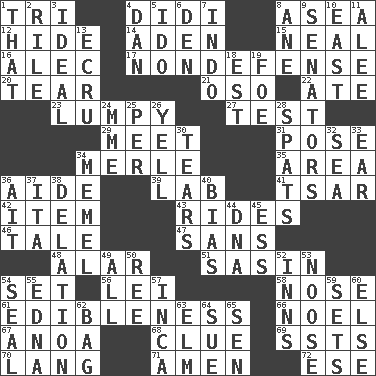 ACROSS 1. Three (prefix) 4. "You Light Up My Life" star Conn 8. At sea 12. Flintstone garb 14. An important port of Yemen 15. Actress Patricia 16. Actor Baldwin 17. Unrelated to defense, as in spending 20. Lacerate 21. Bear (Spanish) 22. Had dinner 23. Containing lumps 27. Trial 29. Rendezvous 31. Airs 34. Haggard of country music 35. Type of rug 36. Assistant 39. Experiment locale 41. Russian ruler of old 42. A distinct part 43. Amusement-park features 46. Falsehood 47. Without 48. Having or resembling wings 51. Indian antelope 54. Put into a specified state 56. Luau accessory 58. Characteristic smell of wine 61. The property of being fit to eat 66. Christmas carol 67. Small Philippine buffalo 68. A slight indication 69. Fast planes 70. Austrian-born American filmmaker Fritz 71. So be it 72. Compass dir. DOWN 1. Not this but _ 2. Cause heat under the collar 3. Perfect 4. Daniel's nick name 5. Wedding promise 6. Lair 7. Southeast Asian peninsula 8. One (Scot) 9. Elected representatives 10. 90 degrees 11. Toward shelter 13. Shade of tan 18. Eastern Standard Time (abbr.) 19. Enemy 24. Madame (abbr.) 25. For each 26. Shout 28. Arguments over trivial matters 30. Pulls apart 32. Ocean 33. Ewer handle 34. Klaipeda city 36. Small island 37. Call ___ day 38. Accusation by an informer 40. Prejudice 44. Heredity factor (abbr.) 45. Curvy letter 49. 100% 50. To separate or throw off 52. Taverns 53. Trap for birds or small mammals 54. Lick closed 55. Pulitzer Prize-winning author Ferber 57. South American Indian 59. Puts into a specified state 60. Otherwise 62. Paper or plastic container 63. Shade tree 64. Take to court 65. Elected rep.