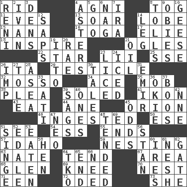ACROSS 1. To free from 4. Hindu god of fire 8. Coat; cloak 11. Nights before holidays 13. Fly high 14. Ear part 15. Nanny 16. Ancient Roman robe 17. Writer Wiesel 18. Stimulate to action 21. Stares at amorously 22. Play the lead 23. Cards in a Roman deck? 25. Compass dir. 26. Call ___ day 29. A testis 32. With motion or animation 34. Adept person 35. Disorderly crowd 38. Entreaty 39. Having a sole or soles 41. Image 43. Ingest 44. One (Scot) 45. Constellation of myth 46. Eaten 50. Compass dir. 51. Observe 54. Curvy letter 55. Conclusions 57. Potato state 59. Inhabiting a nest 63. Nathan's nickname 64. Look after 67. Length times width 68. Small, secluded valley 69. Leg joint 70. Egg locale 71. Car or cant ending 72. Wrote a lyric poem 73. A female animal or person DOWN 1. Painter Guido (1575-1642) 2. _ the terrible 3. Hiding places for outlaws 4. Michaelmas daisies 5. Thick or sticky substance 6. Tired old horse 7. Retirement account (abbr.) 8. For Whom the Bell _____ 9. Off-Broadway awards 10. Honkers 12. Plant excrements 14. Part of a journey 19. "Tell ____ the Marines!" 20. Actress Charlotte 21. Lubricate 23. Louse (plural) 24. On the rocks 26. Mischievous child 27. Lacquered or enameled metalware 28. Toward the sea 30. Falsehoods 31. Arab leader 33. Suttee (variant) 36. Migrant worker of the '30s 37. Scornful sounds 39. Sinks 40. Washington bills 42. Compass dir. 45. Probability 47. Modern: prefix 48. Looked after 49. Compass dir. 51. Burn superficially 52. Peak District village in England 53. Eroded 56. Comedian Laurel of Laurel & Hardy 58. Layer 60. Angers 61. Delicate 62. Yard entry 64. Ring climax 65. Conclusion 66. Born