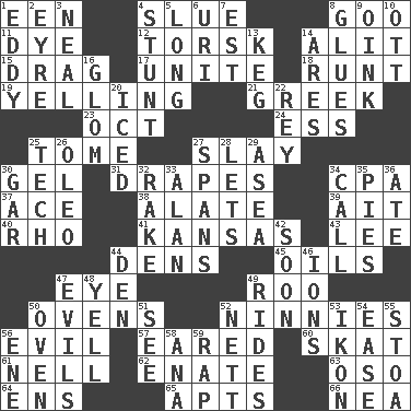 ACROSS 1. Car or cant ending 4. Turn sharply 8. Thick or sticky substance 11. Color 12. Cod relative 14. Set down 15. To be drawn or hauled along 17. Join together 18. The smallest animal of a litter 19. Crying or shouting loudly 21. Hellenic 23. Sep. follower 24. Curvy letter 25. Heavy book 27. Kill 30. Set 31. Window treatments 34. Accounting whiz (abbr.) 37. Adept person 38. Having winglike extensions 39. Small island 40. 17th letter of the Greek alphabet 41. Sunflower state 43. Area sheltered from the wind 44. Cub Scout units 45. Lubricates 47. Sight organ 49. Friend of Pooh 50. Baking chambers 52. Simpletons 56. Tending to cause great harm 57. Having ears or earlike features 60. Three-handed card game 61. 1994 drama film starring Jodie Foster 62. Maternal 63. Bear (Spanish) 64. Followers of ems 65. Tenement units (abbr.) 66. Teachers' org. DOWN 1. Whirlpool 2. Jane of fiction 3. Actress Patricia 4. Difficult or unusual or dangerous feat 5. Yearn 6. RI univ. 7. Eastern Standard Time (abbr.) 8. Adhesives 9. Pig sound 10. Baseball player Mel 13. Barrel 14. Ancient Greek god of war 16. Take by theft 20. On the rocks 22. Marina Del _, California 25. Technical 26. Butter sub 27. Connects, as a bridge 28. Allows 29. Toward the sea 30. Slender fish 32. Immoral or dissolute person 33. Actor Alda or Thicke 34. Give a ring to 35. Sliced desserts 36. Had dinner 42. Within a short period 44. Lair 46. Charged particles 47. Vices 48. Shout 49. Amusement-park features 50. Baking chamber 51. Perceive with the eye 52. Remaining after all deductions 53. Image 54. Relaxation 55. Portico 56. Compass dir. 58. Santa ___, CA 59. Hit sharply and swiftly