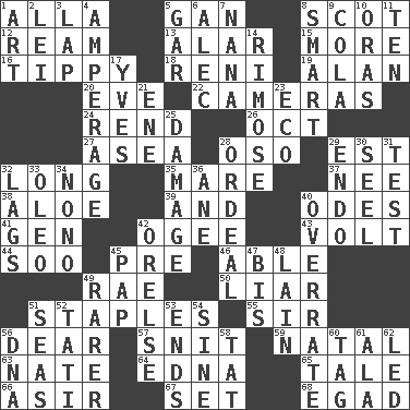 ACROSS 1. Silent film actress Nazimova 5. Separate the seeds from cotton 8. Highlander 12. 480, 500 or 516 sheets of paper 13. Having or resembling wings 15. Greater amount 16. Likely to tip or tilt 18. Painter Guido (1575-1642) 19. ____ Jay Lerner 20. First lady 22. Devices for capturing images 24. Tear apart 26. Sep. follower 27. Toward the sea 28. Bear (Spanish) 29. Eastern Standard Time (abbr.) 32. Yearn 35. Female horse 37. Born 38. _ vera 39. Also 40. Lyric poems 41. Commissioned mil. rank 42. Double curve, resembling the letter S 43. Electrical Unit 44. "Barney Miller" actor Jack 45. Before (prefix) 46. Competent 49. Actress Charlotte 50. One who doesn't tell the truth 51. Paper fasteners 55. Title for a knight 56. Letter starter 57. In a ____ (agitated or irritated) 59. Brizilian seaport 63. Nathan's nickname 64. Pulitzer Prize-winning author Ferber 65. Falsehood 66. SW Saudi Arabia district 67. Arrange properly for use 68. Mild oath DOWN 1. Tate display 2. Flowery wreath 3. Pet locale 4. Electrical Measurement 5. Slender fish 6. Actor Baldwin 7. Grandmother 8. Don Adams' spy role 9. Root beer relative 10. Mouths or openings 11. "___ Little Indians" 14. Full of chinks, cracks, or crevices 17. Jacques Cousteau's middle name 21. Compass dir. 23. Environmental prefix 25. Break 28. Severe or trying experience 29. Inside; within (prefix) 30. Stitch closed the eyes of (a falcon) 31. Trial 32. Straggles 33. Butter sub 34. Words to Nanette 36. One (Scot) 40. Make much ado about nothing 42. Threatening words 45. Infant food 47. Altar cloth linen 48. (Had) reclined 49. More valued for its uncommonness 51. Oceans 52. Jacques of French films 53. Conclusions 54. Trig term 56. Heredity factor (abbr.) 58. Make lace 60. Label 61. Insect wing 62. Directed