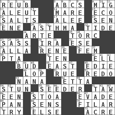 ACROSS 1. Reuben's nickname 5. Lettered men learn these first 9. Russian fighter aircraft 12. Native American of Southwest Alaska 14. Female horse 15. Environmental prefix 16. Table seasonings 17. Toward shelter 18. Elected rep. 19. Compass dir. 20. Respiratory problem 23. Event that recurs at intervals 24. Johnson of "Laugh-In" 25. Torque (variant) 27. Backtalk 30. Lyricist Gershwin 32. Compass dir. 33. Silent film actress Nazimova 34. French philosopher Descartes 36. Opposite of masc. 38. Parent Teacher Association (abbr.) 39. Nine, plus one 40. Pipe bend 43. Partially opened flower 46. Compass direction 48. Singer Brickell 49. Trim (branches) 51. Regret 52. Make new 53. Grandmother 54. Singer James 56. Astound 58. Sowing specialist 61. The 23rd letter of the Hebrew alphabet 64. Car or cant ending 65. Portico 66. Dodge 68. Baking dish 69. Elected reps. 70. Having threads 71. Attempt to accomplish something 72. Otherwise 73. Measure of real estate DOWN 1. To erase 2. Style 3. Ubangi River tributary 4. Yet 5. Housemaid 6. Lip ointment 7. Cause to be 8. Perceive with the eye 9. Of or pertaining to a meson 10. On the rocks 11. Went 13. Russian ruler of old 21. Move through with a circular motion 22. Cylindrical with tapered ends 23. Relationship diagram 24. White ___ sheet 26. Order of Saint Francis (abbr.) 27. Plant excrement 28. The first octave above the treble staff 29. Thick slice 31. Approach 35. Followed as a consequence or result 37. Ancient Persian 41. Hat (slang) 42. Lion 44. ____ Bator, Mongolia 45. Spanish title 47. False hair 48. Epoch 50. Soft color 53. Pet term 55. Not kosher 56. Back-to-school mo. 57. Pull into pieces 59. Immeasurably long periods of time 60. Relaxation 61. Baby powder 62. The sixth month of the Jewish calendar 63. We are 65. Compass dir. 67. By way of