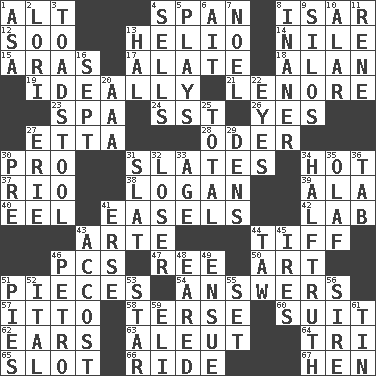 ACROSS 1. Keyboard modifier key 4. Connect, as a bridge 8. Austrian river, tributary to the Danube 12. "Barney Miller" actor Jack 13. Sun: prefix 14. "Death on the ____" 15. Ancient river in northeast Turkey 17. Having winglike extensions 18. Actor Alda or Thicke 19. Under perfect conditions 21. Poe poem 23. Health resort 24. Fast jet (abbr.) 26. It is so 27. Singer James 28. River in Europe 30. Adept person 31. Chalkboards 34. Being at a high temperature 37. River (Sp.) 38. Utah city north of Ogden 39. Chicken ___ king 40. Snakelike fish 41. Artist's stands 42. Experiment locale 43. Johnson of "Laugh-In" 44. Small quarrel 46. Personal Computers (abbr.) 47. To separate or throw off 50. Tate display 51. Components 54. Statements in reply to questions 57. "Tell ____ the Marines!" 58. Laconic 60. Costume for a special activity 62. Hearing organs 63. Eskimo relative 64. Three (prefix) 65. Narrow, elongated depression 66. Travel on an animal 67. Layer DOWN 1. White ___ sheet 2. Australian parrot (variant) 3. Inedible or poisonous agaric 4. Makes a sale 5. Romps 6. Small island 7. Christmas carol 8. More lacking in sense or substance 9. Grain storage towers 10. Having or resembling wings 11. French philosopher Descartes 13. Actor Linden 16. Back-to-school mo. 20. American Automobile Association (abbr.) 22. Sight organs 25. Add up to 27. One of the Great Lakes 29. Lairs 30. Before (prefix) 31. Narrow board 32. Failure 33. Personal question 34. Not exactly gospel 35. Norwegian king 36. Bar bill 41. Celtic language 43. Buttonhole 44. The 23rd letter of the Hebrew alphabet 45. Angers 46. Stone: prefix 48. Having ears or earlike features 49. Take place subsequently 51. Sliced desserts 52. Slanted text style (abbr.) 53. Play the lead 55. Arrange properly for use 56. The founder of a family 59. Biblical high priest 61. Shallow baking pan