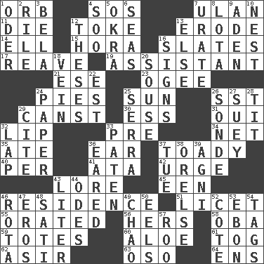 ACROSS 1. Globe 4. Distress signal 7. ____ Bator 11. Expire 12. Casino tip 13. Eat (away) 14. Pipe bend 15. Israeli folk dance 16. Chalkboards 17. Rob, plunder, or pillage 19. Helper 21. Compass dir. 23. Double curve, resembling the letter S 24. Sliced desserts 25. Player for Phoenix 26. Fast jet (abbr.) 29. 2nd pers. sing. pres. of can (arch.) 30. Curvy letter 31. Fr. "Yes" 32. Mouth edge 33. Before (prefix) 34. Fish or hair follower 35. Had dinner 36. Hearing organ 37. Sycophant 40. For each 41. "One Day ___ Time" 42. Goad 43. Old wives' tales, e.g. 45. Car or cant ending 46. Home 51. It is permitted: Lat. 55. Declaimed 56. Possessive pronoun 58. Chief or king in Benin or Nigeria 59. Lugs 60. Medicinal plant 61. Coat; cloak 62. SW Saudi Arabia district 63. Bear (Spanish) 64. Followers of ems DOWN 1. Baltic tributary 2. Cause heat under the collar 3. Actor Lugosi 4. "Barney Miller" actor Jack 5. Gumbo ingredient 6. Oceans 7. A salt of uric acid 8. Globular water bottle used in Asia 9. Arabian gulf 10. A home for chicks 12. College papers 13. Otherwise 16. Signals 18. Distinctive style or manner 20. Lush 22. Eastern Standard Time (abbr.) 24. Some stationery 25. Spanish missionary in California 26. Message 27. Chop _ 28. Teat (slang) 29. Quote 32. Infant locale 33. Eucharist need 36. Having ears or earlike features 37. Third day of the wk. 38. Threatening words 39. Hindu god of fire 43. 61 cubic inches 44. Lyric poems 46. Round or rotation of duties 47. Greek god of love 48. Suttee (variant) 49. US Secretary of Labor Elaine L. _ 50. Snakelike fish 52. ____ d'Azur (French Riviera) 53. Inky black, to poets 54. Labels 57. Friend of Pooh