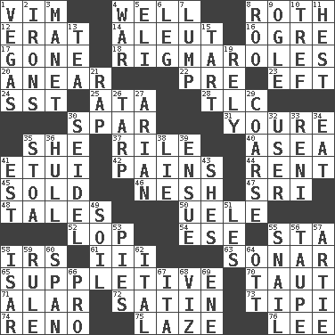 ACROSS 1. Zeal 4. Not ill 8. Writer of Portnoy's Complaint (1969) 12. Part of Q.E.F. 14. Eskimo relative 16. Legendary monster 17. Went 18. Complicated, petty procedures 20. Approach 22. Before (prefix) 23. Bank Draft (abbr.) 24. Fast jet (abbr.) 25. "One Day ___ Time" 28. Affectionate concern, for short 30. Coast Guard woman 31. You are 35. A female animal or person 37. Cause heat under the collar 40. At sea 41. Needle holder 42. Aches 44. Monthly bill 45. Exchanged or delivered for money 46. Soft 47. Indian title of respect (Mr.) 48. Stories 50. Ubangi River tributary 52. Chop off 54. Compass dir. 55. R.R. building 58. Big collection agency 61. One more than two 63. Underwater navigation system 65. Supplementary 70. Tense 71. Having or resembling wings 72. Smooth fabric 73. Native american tent (variation) 74. Former U.S. Attorney General Janet 75. Goldbrick 76. Area sheltered from the wind DOWN 1. Viva Las _ 2. Metal shackles 3. French painter Edouard 4. Armed conflict 5. Connecticut Ivy Leaguer 6. Part of a journey 7. Mass 8. Friend of Pooh 9. Stare at amorously 10. Not kosher 11. Command 13. Afternoon social gathering 15. Small pie 19. Have confidence or faith in 21. Hit sharply and swiftly 26. Canvas cover 27. Believer in; advocate of (suffix) 29. Unrefined 30. Beer mug 32. One who uses or employs something 33. Painter Guido (1575-1642) 34. Consume 35. Portico 36. Frame or body of a ship 38. Whopper 39. Take place subsequently 41. Eastern Standard Time (abbr.) 43. "______ My Girl" (Turtles hit) 49. Earth 51. French article 53. Sliced desserts 55. Slow-paced one 56. Grayish beige 57. Nick name for Arthur 58. Austrian river, tributary to the Danube 59. Governing power 60. Connect, as a bridge 62. Slanted text style (abbr.) 64. Baseball player Mel 66. Adept person 67. Call ___ day 68. That is 69. Compass dir.