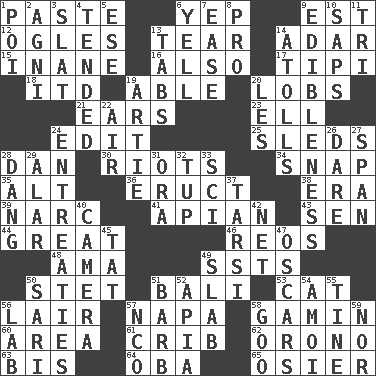 ACROSS 1. Thick mixture 6. Slangy assent 9. Eastern Standard Time (abbr.) 12. Stares at amorously 13. Rend 14. The sixth month of the Jewish calendar 15. Silly 16. In addition 17. Native american tent (variation) 18. It would 19. Competent 20. Tennis shots 21. Hearing organs 23. Pipe bend 24. Prepare for publication 25. Bobsleighs 28. Daniel's nick name 30. Debaucheries 34. Fastener 35. The first octave above the treble staff 36. Spew [out] 38. Period 39. Drug cop 41. Bee-related 43. Elected rep. 44. Relatively large 46. Vintage cars 48. Wet nurse (var.) 49. Fast planes 50. Proofreading order 51. Indonesian resort city 53. Domesticated feline 56. Den 57. California wine valley 58. Homeless child 60. Type of rug 61. Baby bed with high sides 62. U. of Maine site 63. Again 64. Chief or king in Benin or Nigeria 65. Flexible twig of a willow tree DOWN 1. Luau course 2. Hindu god of fire 3. Narrow board 4. Watched over 5. Compass dir. 6. Shout 7. Comfort 8. Adept person 9. The property of being fit to eat 10. Plant excrements 11. Three (prefix) 13. Bar bills 14. Ringlike coral islands and reefs 19. Nick name for Arthur 20. French article 22. Atmosphere 24. Pleas 26. Have the gumption 27. Connect, as a bridge 28. Mild oath, euphamism for damn 29. Having or resembling wings 31. Mouth or opening 32. Uncastrated adult male sheep 33. _-fi 37. Tarsus (plural) 40. Device for capturing images 42. Fish or hair follower 45. Make lace 47. Motion picture awards 49. Thick slice 50. Indian skirt 51. Sharp remark 52. Capital of Western Samoa 54. Mine, in Marseilles 55. Prong on a fork 56. Experiment locale 57. Non-commissioned officer (abbr.) 58. Thick or sticky substance 59. And not