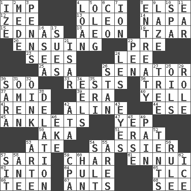 ACROSS 1. Mischievous child 4. Event scenes 8. Otherwise 12. Last letter of the English alphabet 13. Butter sub 14. California wine valley 15. Ferber et al. 18. Age 19. Russian ruler 20. Following as a consequence or result 22. Before (prefix) 23. Observes 24. Area sheltered from the wind 25. White ___ sheet 26. Elected representative 30. "Barney Miller" actor Jack 33. Musical pauses 36. Musical group of three 37. Among 39. Epoch 40. Shout 41. French philosopher Descartes 42. Place in a line 44. Compass dir. 45. Short socks 47. Slangy assent 50. Alias (abbr.) 51. Part of Q.E.F. 53. Had dinner 54. More disrespectful 57. Indian skirt 59. Burn to charcoal 61. World-weariness 63. To the inside or interior of 64. Whimper 65. Affectionate concern, for short 66. Adolescent 67. Pismires 68. Observe DOWN 1. Ending with capital 2. Ancient Persian 3. Actor Sean's family 4. Grant temporary use of 5. Cassini of fashion 6. Corporate head (abbr.) 7. Electrically charged atom 8. Plea 9. Goldbrick 10. Health resort 11. Ewer handle 16. Toward the sea 17. Takes to court 21. Austrian river, tributary to the Danube 22. Writing instrument 24. French article 26. Comedian Laurel of Laurel & Hardy 27. Woody plant 28. Petroleums 29. Hero or heavy, e.g. 30. "Two Mules for Sister ____" 31. Sign of things to come 32. Pig sound 34. Snakelike fish 35. Indian title of respect (Mr.) 38. Accusation by an informer 42. "One Day ___ Time" 43. Snake ____ (dice throw) 46. Make supply last 48. Celtic language 49. Ache 52. Portable shelters 53. Johnson of "Laugh-In" 54. Table seasoning 55. Ancient Greek god of war 56. Court order 57. Be seated 58. A saturated hydrocarbon 59. Tax preparer (abbr.) 60. Attila the _ 62. Frozen water