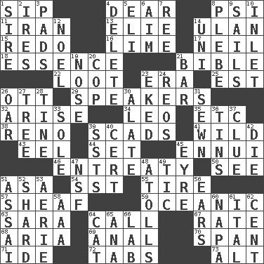 ACROSS 1. Small drink 4. Letter starter 8. Air pressure measure (abbr.) 11. SW Asia republic 13. Writer Wiesel 14. ____ Bator, Mongolia 15. Redecorate 16. Welles in "The Third Man" 17. Famous astronaut Armstrong 18. Gist 21. The Good Book 22. Spoils 23. Period 25. Eastern Standard Time (abbr.) 26. Baseball player Mel 29. Orators 32. Get up 34. Lion 35. And so on (abbr.) 38. Western Nevada city 39. Oodles 41. Uncontrolled 43. Snakelike fish 44. Put into a specified state 45. World-weariness 46. Plea 50. Perceive with the eye 51. White ___ sheet 54. Fast jet (abbr.) 55. Become fatigued 57. Bundle of cut stalks of grain 59. Pertaining to the sea 63. "Two Mules for Sister ____" 64. Give a ring to 67. Pace 68. Operatic vocal solo 69. Of or related to the anus 70. Connect, as a bridge 71. Binary compound 72. Bar bills 73. Keyboard modifier key DOWN 1. The founder of a family 2. Angers 3. Groovy apts. 4. Erase 5. Connecticut Ivy Leaguer 6. Direct toward a target or goal 7. To riddle 8. Cadet 9. Travel by water 10. An arm off of a larger body of water 12. Christmas carol 14. University (slang) 19. Sense of smell 20. Police officer (slang) 21. Soap unit 23. Made supply last 24. Vintage cars 26. Boat paddle 27. Woody plant 28. Prong on a fork 30. Having winglike extensions 31. Stitched 33. Not divided or shared with others 36. Canisters 37. A slight indication 39. Fast planes 40. Certainty 42. Pass on 45. Jane of fiction 47. Overdraft (abbr.) 48. Ringlike coral islands and reefs 49. Nervous spasm 51. Slender Brazilian palm 52. Broken piece 53. Nest on high 56. Hearing organs 58. American Automobile Association (abbr.) 60. California wine valley 61. Slanted text style (abbr.) 62. Penny 64. Feline 65. Santa ___, CA 66. Experiment locale