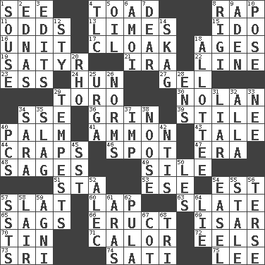 ACROSS 1. Observe 4. Frog relative 8. Hit sharply and swiftly 11. Likelihood 13. Citrus fruits 15. Wedding promise 16. A single undivided whole 17. Hide under a false appearance 18. Ripens 19. Man with strong sexual desires 21. Lyricist Gershwin 22. Actor's bit 23. Double-curved letter 24. Attila the _ 27. Set 29. "Corrida" creature 30. Pitcher Ryan 34. Compass dir. 36. Smile widely 39. Vertical member of a panel or frame 40. Inside of hand 41. ID or VA city 43. Story 44. Dice game 46. Blemish 47. Period 48. Gurus 49. Filth; sediment 51. R.R. building 53. Compass dir. 54. Eastern Standard Time (abbr.) 57. Narrow board 60. Pet locale 63. Schedule 65. Droops 66. Spew [out] 69. Austrian river, tributary to the Danube 70. Shallow baking pan 71. Bodily heat indicating an inflammation 72. Snakelike fish 73. Indian title of respect (Mr.) 74. Suttee (variant) 75. Area sheltered from the wind DOWN 1. Boozer 2. Ferber et al. 3. Prepares for publication 4. Affectionate concern, for short 5. Lubricate 6. Mine, in Marseilles 7. Letter starter 8. Swiss mountan, "Queen of the Mountains" 9. An important port of Yemen 10. Airs 12. Filthy place 14. Heroin 18. One to whom something is allotted 20. 17th letter of the Greek alphabet 25. Capital and largest city of Mongolia 26. Typical models 28. Followers of ems 29. Storms 31. One who doesn't tell the truth 32. Silent film actress Nazimova 33. Born 34. "Two Mules for Sister ____" 35. Volcanic refuse 37. Naughty child 38. Trap for birds or small mammals 40. Personal Computers (abbr.) 42. Nuclear Threat Initiatives 45. Fast jet (abbr.) 50. French article 52. Actor Baldwin 54. Artist's stand 55. Having lost freshness 56. Laconic 57. Fast planes 58. Den 59. Hindu god of fire 61. Caspian sea tributary 62. Monetary unit of Botswana 64. Untruth 67. Small bed 68. Three (prefix)