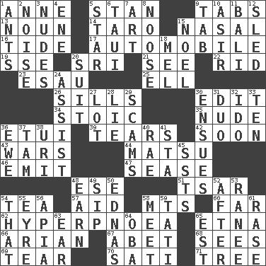 ACROSS 1. Queen of England 1702-14 5. Comedian Laurel of Laurel & Hardy 9. Bar bills 13. Part of speech 14. Edible starchy tuberous root 15. Relating to the nose 16. Periodic rise and fall of the sea level 17. Form of transportation 19. Compass dir. 20. _ Lanka 21. Observe 22. To free from 23. He sold his birthright 25. Pipe bend 26. Beverly of Met fame 30. Prepare for publication 34. Unemotional 35. Naked 36. Needle holder 39. Pulls apart 42. Within a short period 43. Armed conflicts 44. Taiwanese island in East China Sea 46. Give off 47. Gospel singer Marvin 48. Compass dir. 51. Russian ruler of old 54. Beverage made from leaves 57. Help 58. Mountains (abbr.) 60. At a great distance 62. Abnormally rapid or deep breathing 65. Inactive volcano in Sicily 66. Believer in; advocate of (suffix) 67. Collude with 68. Observes 69. Rend 70. Suttee (variant) 71. Family _ (genealogy) DOWN 1. Pismires 2. Annoying sound 3. Unadorned figures 4. Compass dir. 5. Play the lead 6. "Change" in Tahitian 7. Tate display 8. Trap for birds or small mammals 9. Bar bill 10. SW Saudi Arabia district 11. Indonesian resort city 12. Downhill vehicle 15. Christmas carol 18. Cartoonist voice _ Blanc 20. Set of matching outer garments 24. Aid 27. Car dealer's back yard 28. Untruth 29. Fraudulent business schemes 30. Follows as a consequence or result 31. Superhero pair 32. Wedding promise 33. Nine, plus one 36. She-sheep 37. Scottish cap 38. RI univ. 40. Actress Charlotte 41. R.R. building 45. Fast planes 48. Merit 49. Small drink 50. Ferber et al. 52. Following 53. The wife of a rajah (variant) 54. Not this but _ 55. Jane of fiction 56. Capital of Western Samoa 58. Rendezvous 59. Jacques of French films 61. To erase 63. Hearing organ 64. Chief or king in Benin or Nigeria 65. Eastern Standard Time (abbr.)