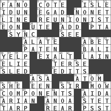 ACROSS 1. Papal veil 5. ____ d'Azur (French Riviera) 9. Capri or Wight 13. Goddess of spring and wife of Bragi 14. Mild oath 15. Music written for nine 16. Actor's bit 17. One who advocates reunion 19. Age 20. Shoshoni 21. Increase 22. Parent Teacher Assoc. 23. Synchronize (abbr.) 25. Observe 26. Having winglike extensions 30. Collude with 34. Eucharist need 35. Indonesian resort city 36. Sharp bark 39. Glorify 42. (Had) reclined 43. Writer Wiesel 44. Laconic 46. Downhill vehicle 47. Proofreads 48. White ___ sheet 51. Smallest unit of an element 54. A female animal or person 57. Car or cant ending 58. Title for a knight 60. Cut the grass 62. Parts 65. Opera by Verdi 66. Believer in; advocate of (suffix) 67. Small Philippine buffalo 68. Proofreading order 69. Canvas cover 70. Stern 71. Inconspicuous attention getter DOWN 1. Do some clerical work 2. Goodbye (Sp.) 3. Pet term 4. Single 5. Foregone conclusion 6. Double curve, resembling the letter S 7. The 19th letter of the Greek alphabet 8. Ferber et al. 9. Electrically charged atom 10. Clip 11. For fear that 12. Singer James 15. Thickened enlargement 18. Binary compound 20. Southern CA. univ. 24. Slept 27. Had dinner 28. John Ritter's dad 29. Related on the mother's side 30. Most capable 31. Sound made by sheep 32. Connecticut Ivy Leaguer 33. Metal container 36. It is so 37. Pipe bend 38. Falsehood 40. Directed 41. Three (prefix) 45. Play the lead 48. A really long time 49. Elected rep. 50. Approach 52. Leaves out 53. Methods 54. Scram! 55. Israeli folk dance 56. Arab leader 58. Portico 59. Austrian river, tributary to the Danube 61. Electrical Unit 63. Infant food 64. Compass dir. 65. Viper