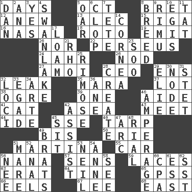 ACROSS 1. 24-hour periods 5. Sep. follower 8. Cy Young winner Saberhagen 12. Afresh 13. Actor Baldwin 15. Port city in Latvia 16. Rhinal 18. Printing process, for short 19. Give off 20. And not 22. Son of Zeus who helped slay Medusa 24. Cowardly lion portrayer 26. Dreamland 27. Mine, in Marseilles 28. Corporate head (abbr.) 29. Followers of ems 32. Path through which fluid escapes 35. Hindu Mythology: god of death 37. Car dealer's back yard 38. Legendary monster 39. Single 40. Assistant 41. Domesticated feline 42. Toward the sea 43. Confront 44. Binary compound 45. Compass dir. 46. Canvas cover 49. Twice 50. 4th largest of the Great Lakes 51. Chrissie's court nemesis 55. 4-wheeled motor vehicle 56. Nanny 57. Elected reps. 59. Shoestrings 63. Part of Q.E.F. 64. Prong on a fork 65. Global Positioning Systems (abbr.) 66. Snakelike fish 67. Area sheltered from the wind 68. Compass direction DOWN 1. Daniel's nick name 2. Santa ___, CA 3. It is so 4. Tchaikovsky ballet 5. Boat paddle 6. Hoof sound 7. False hair 8. A special lineage 9. Tall New Zealand timber tree 10. Armor plate that protects the chest 11. Make lace 14. Pupil covering 17. Rich soil 21. 17th letter of the Greek alphabet 23. "Barney Miller" actor Jack 25. Full of chinks, cracks, or crevices 28. Make 29. Writer Wiesel 30. Connecting point 31. Proofreading order 32. Locales 33. Mild oath 34. Johnson of "Laugh-In" 36. A saturated hydrocarbon 40. Electrical Measurement 42. Aid 45. Be seated 47. Curve 48. Monetary unit of Yemen 49. Naughty children 51. Female horse 52. Of or related to the anus 53. Famous astronaut Armstrong 54. Queen of England 1702-14 56. Born 58. Perceive with the eye 60. Accounting whiz (abbr.) 61. Curvy letter 62. Fast jet (abbr.)