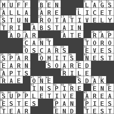ACROSS 1. Perform or handle clumsily 5. Benjamin's nick name 8. Fails to keep up a pace 12. Silent film actress Nazimova 13. "We ___ not amused" (Victoria) 14. It is permitted: Lat. 15. Surprise greatly 16. Rotating or pertaining to rotation 19. Three (prefix) 20. Refrain by choice 21. The sixth month of the Jewish calendar 23. Had dinner 24. Hit sharply and swiftly 27. Patter 30. "Corrida" creature 31. Motion picture awards 34. Nights before holidays 35. Practice fight 38. Leaves out 40. Egg locale 41. Merit 42. Flew 44. Flats, for short 45. Cause heat under the collar 46. Actress Charlotte 47. Single 50. Neighbor of Neb. 53. Heighten or intensify 57. Compass dir. 59. Supplementary 63. Type of rug 64. _____ Park, CO 65. Baking dish 66. Sliced desserts 67. Separate forcefully 68. Conclude 69. Trial DOWN 1. Vertical spar for supporting sails 2. Extremist 3. Watery 4. Avid follower 5. Sharp remark 6. Greek god of love 7. Remaining after all deductions 8. 54 in ancient Rome 9. Adept person 10. Set 11. Filthy place 14. Actor's bit 17. American Automobile Association (abbr.) 18. Teat (slang) 20. Ancient river in northeast Turkey 22. Oak nuts 24. Be footloose 25. Ancient Greek god of war 26. Mail 28. Non-commissioned officer (abbr.) 29. Scottish caps 30. Looked after 32. _ de Janeiro 33. Play the lead 35. Wither 36. Dad 37. Johnson of "Laugh-In" 39. Indian title of respect (Mr.) 43. Otherwise 47. Petroleums 48. Compass dir. 49. Eastern Standard Time (abbr.) 51. Nest on high 52. Leg joints 54. Corncob 55. _ the terrible 56. Tear apart 58. 90 degrees 59. Put into a specified state 60. Purpose 61. Parent Teacher Association (abbr.) 62. For each 63. Fitting