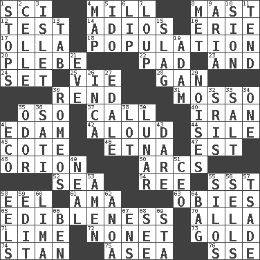 ACROSS 1. _-fi 4. Place where flour is made 8. Vertical spar for supporting sails 12. Trial 14. Goodbye (Sp.) 16. One of the Great Lakes 17. Rounded earthenware pot or jar 18. Census information 20. Cadet 22. Writing tablet 23. Added to 24. Put into a specified state 25. Compete 28. Separate the seeds from cotton 30. Tear apart 31. With motion or animation 35. Bear (Spanish) 37. Give a ring to 40. SW Asia republic 41. Dutch treat 42. Verbally 44. Filth; sediment 45. ____ d'Azur (French Riviera) 46. Inactive volcano in Sicily 47. Eastern Standard Time (abbr.) 48. Constellation of myth 50. Arches 52. Ocean 54. To separate or throw off 55. Fast jet (abbr.) 58. Snakelike fish 61. Wet nurse (var.) 63. Off-Broadway awards 65. The property of being fit to eat 70. Silent film actress Nazimova 71. Welles in "The Third Man" 72. Music written for nine 73. Aureate 74. Comedian Laurel of Laurel & Hardy 75. Toward the sea 76. Compass dir. DOWN 1. Ceases 2. Cell (Danish) 3. Small island 4. Atlas unit 5. Wedding promise 6. Mouth edge 7. Central Nebraska county 8. Was introduced to 9. Operatic vocal solo 10. The Jewish people; Israel 11. Look after 13. Keyboard key 15. Volcanic refuse 19. First of billions? 21. Night before a holiday 26. South American Indian 27. Peak District village in England 29. Annoying sounds 30. Lover boys 32. Indian titles of respect 33. Table seasoning 34. Single 35. Aroma 36. Suttee (variant) 38. Car dealer's back yard 39. Type of eclipse 41. Environmental prefix 43. Have the gumption 49. Anneal 51. Corporate head (abbr.) 53. So be it 55. Grain storage towers 56. Makes a sale 57. Sadhe (variant) 58. Snakelike fish 59. Prepare for publication 60. Pale green bean 62. Small Philippine buffalo 64. Container for groceries 66. Benjamin's nick name 67. Followers of ems 68. Perceive with the eye 69. R.R. building