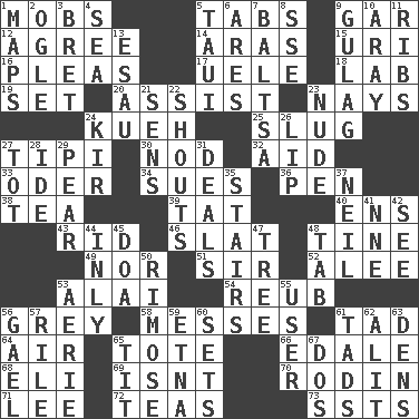 ACROSS 1. Disorderly crowds 5. Bar bills 9. Slender fish 12. Match 14. Caspian sea tributary 15. RI univ. 16. Entreaties 17. Ubangi River tributary 18. Experiment locale 19. Put into a specified state 20. Help 23. Negative votes 24. Malaysian steamed pastry 25. Strike heavily 27. Native american tent (variation) 30. Allow head to fall sleepily 32. Help 33. River in Europe 34. Takes to court 36. Animal enclosure 38. Afternoon social gathering 39. Make lace 40. Followers of ems 43. To free from 46. Narrow board 48. Prong on a fork 49. Not either 51. Title for a knight 52. Toward shelter 53. Jai ____ 54. Reuben's nickname 56. Jennifer or Joel 58. Makes clutter 61. Small amount or degree 64. Wind 65. Carryall 66. Peak District village in England 68. Biblical high priest 69. Is not 70. "The Thinker" sculptor 71. Area sheltered from the wind 72. Beverages made from leaves 73. Fast planes DOWN 1. Atlas contents 2. Stare at amorously 3. Cy Young winner Saberhagen 4. Ocean 5. "Change" in Tahitian 6. Ancient Greek god of war 7. Greek mezzo-soprano Agnes 8. Compass dir. 9. Russian prison camp 10. Like ___ of sunshine 11. Teases 13. He sold his birthright 21. Elected reps. 22. Yells 23. Unadorned 24. Apertif with cassis 26. Mouth edge 27. Small child 28. Binary compound 29. Lightbulb-shaped fruit 31. Allots cards 35. Flight of steps 37. Famous astronaut Armstrong 41. Compass dir. 42. Observe 44. Inwardly 45. ___ good deed 47. Relationship diagram 48. Bar bill 50. Full of chinks, cracks, or crevices 53. Nest on high 55. One who makes use of a thing 56. Highlander 57. Cause heat under the collar 59. Inactive volcano in Sicily 60. Arranges properly for use 61. Small amounts or degrees 62. Set down 63. Lairs 65. Teat (slang) 67. Two (Sp.)