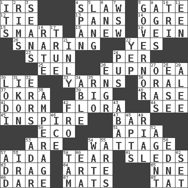 ACROSS 1. Big collection agency 4. Cole _ (cabbage dish) 8. Yard entry 12. Standoff 13. Zero-star reviews 14. Legendary monster 15. Don Adams' spy role 18. Afresh 19. Distinctive style or manner 20. Catching in a trap 22. Consenting reply 23. Astound 24. For each 25. Snakelike fish 26. Normal relaxed breathing 30. Untruth 33. Entertaining tales 36. Of the mouth 37. Gumbo ingredient 39. Massive 40. To erase 41. Dormintory (informal) 42. Plants 44. Observe 45. Motivate 47. Drinking establishment 50. Environmental prefix 51. Capital of Western Samoa 53. "We ___ not amused" (Victoria) 54. Electrical Measurement 57. Opera by Verdi 59. Lacerate 61. Bobsleighs 63. To trail on the ground 64. Johnson of "Laugh-In" 65. Compass dir. 66. Have the gumption 67. Floor coverings 68. Make lace DOWN 1. ___ a Wonderful Life 2. Basketball hoops 3. Seines 4. Connect, as a bridge 5. Long (Scottish) 6. One (Scot) 7. Compass dir. 8. State head 9. Ripens 10. Three (prefix) 11. Car or cant ending 16. Pace 17. Loyal 21. In an inward manner 22. Slangy assent 24. Ichor 26. Engineer (abbr.) 27. Mouths or openings 28. Comfort 29. Toward shelter 30. Farming town in central California 31. Visual representation of an object 32. Blunders 34. Competent 35. _ de Janeiro 38. Electrical Measurement 42. Away 43. Blind as ____ 46. Frozen water 48. Flats, for short 49. Monetary unit of Yemen 52. Rep 53. The sixth month of the Jewish calendar 54. Electrical Unit 55. Ancient Greek god of war 56. Pulitzer Prize-winning author Ferber 57. Find the sum of 58. Retirement account (abbr.) 59. Scottish cap 60. Period 62. Arrange properly for use