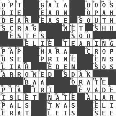 ACROSS 1. Elect 4. Greek goddess of the earth (variant) 8. Scornful sounds 12. Expire 13. Merit 14. Brightly colored fish 15. Letter starter 17. Comfort 18. Compass direction 19. Strangle with an iron collar 21. Soggy 23. Quiet! 24. _____ Park, CO 26. "Barney Miller" actor Jack 28. Writer Wiesel 30. Pulling apart 34. Infant food 37. Hindu Mythology: god of death 39. Riding implement 40. Purpose 41. First class 43. Followers of ems 44. One who doesn't tell the truth 46. Locale of original sin 47. Distress signal 48. Moved like an arrow 51. Neighbor of Neb. 54. Sound made by sheep 55. Speak pompously 58. Parent Teacher Association (abbr.) 61. Three (prefix) 63. Elude 65. Small island 67. Nathan's nickname 71. Having or resembling wings 72. Friends 73. It was, poetically 74. Biblical high priest 75. Part of Q.E.F. 76. Allows 77. Observe DOWN 1. Probability 2. Part 3. Pulls apart 4. Turn to the right 5. Auto club (abbr.) 6. Big collection agency 7. Afresh 8. Sometimes accompanies a hiss 9. Musical composition 10. Pledge 11. Quiet! 16. Pace 18. Portico 20. Set 22. Compass dir. 25. Simple or foolish person 27. The grampus (Milton) 29. Having ears or earlike features 30. Makes less strong or intense 31. Angers 32. Words to Nanette 33. Global Positioning Systems (abbr.) 34. Monetary unit of Botswana 35. SW Saudi Arabia district 36. Lightbulb-shaped fruit 38. To free from 42. Inside; within (prefix) 45. Director Reiner 49. Electrical Unit 50. Hearing organ 52. "We ___ not amused" (Victoria) 53. Polynesian shrub of the pepper family 56. Stories 57. Peak District village in England 58. Corncob 59. Russian ruler of old 60. Silent film actress Nazimova 62. International (abbr.) 64. 4th largest of the Great Lakes 66. Eastern Standard Time (abbr.) 68. Deep reverence 69. Make lace 70. Curvy letter