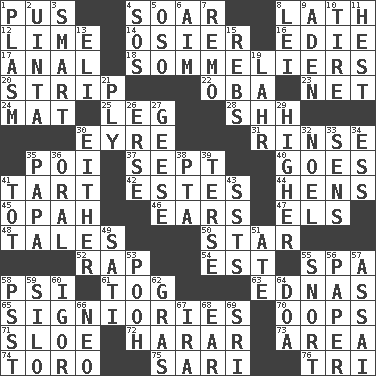 ACROSS 1. Festering 4. Fly high 8. Thin strip of wood or metal 12. Welles in "The Third Man" 14. Flexible twig of a willow tree 16. Singer Brickell 17. Of or related to the anus 18. Wine waiters 20. Empty completely 22. Chief or king in Benin or Nigeria 23. Fish or hair follower 24. Floor protector 25. Part of a journey 28. Quiet! 30. Jane of fiction 31. Remove soap 35. Luau course 37. Back-to-school mo. 40. Travels 41. Small pie 42. _____ Park, CO 44. Coop moms 45. Brightly colored fish 46. Hearing organs 47. Raised railways 48. Falsehoods 50. Play the lead 52. Hit sharply and swiftly 54. Eastern Standard Time (abbr.) 55. Health resort 58. 23rd letter of the Greek alphabet 61. Coat; cloak 63. Ferber et al. 65. Seigniories (variant) 70. I made a mistake 71. A type of plum 72. Ethiopian city, capital of Harari 73. Length times width 74. "Corrida" creature 75. Indian skirt 76. Three (prefix) DOWN 1. Suffix with ecto or cyto 2. National forest in Provo, Utah 3. Don Adams' spy role 4. Distress signal 5. Bear (Spanish) 6. Direct toward a target or goal 7. San ____ (Riviera town) 8. Luau accessory 9. Arabian gulf 10. Hoop that covers a wheel 11. Command 13. Connecticut Ivy Leaguer 15. Confederate soldiers (slang) 19. Cowardly lion portrayer 21. Travel a route regularly 26. Celtic language 27. Honkers 29. Having greater elevation 30. One or the other of two 32. Christmas carol 33. Elected reps. 34. Curvy letter 35. Dad 36. Spoken 38. Parent Teacher Association (abbr.) 39. Laconic 41. Small child 43. Fast planes 49. Suttee (variant) 51. Had dinner 53. "Silly old bear" 55. Derisive sound 56. Some stationery 57. Slender Brazilian palm 58. Inconspicuous attention getter 59. Grain storage tower 60. Russian composer Stravinsky 62. Pate de foie ____ 64. ___ good deed 66. Modern: prefix 67. Lyricist Gershwin 68. Ewer handle 69. _ Lanka
