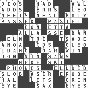 ACROSS 1. "Vaya con ____" 5. Possessed 8. Leather borer 11. Sums up 12. Blunders 14. Lion 15. Confronts 17. Anneal 18. Many (prefix) 19. Went by 21. Soft color 23. A really long time 25. Singer James 26. Silent film actress Nazimova 27. Compass dir. 28. Prohibit 31. Shade tree 33. Three (prefix) 35. Sadhe (variant) 37. Small Philippine buffalo 38. Music discs 40. Butter sub 41. Potato state 43. Rowing implement 45. Victory 46. Spanish title 47. Zeal 50. Without 52. Ancient Persian 53. What Jean-Claude Killy likes to do 54. Gives a jingle 56. Dodged 61. Messy guy 62. SW Saudi Arabia district 65. Eat (away) 66. Actor Linden 67. Allows 68. Amused look 69. Sight organ 70. Saxophone 71. Sight organs DOWN 1. Moist 2. It may be bright or harebrained 3. Lyric poems 4. Fast planes 5. Layer 6. "We ___ not amused" (Victoria) 7. Window treatments 8. _ vera 9. Not ill 10. Myrna of the movies 13. Narrow boards 16. Sew up the eyelids of hawks and falcons 18. Parent Teacher Assoc. 20. Dunce 22. Proofreading order 24. Drug cop 26. Housemaid 28. Indonesian resort city 29. An important port of Yemen 30. Modern: prefix 31. Inside; within (prefix) 32. Grant temporary use of 34. Wedding promise 36. Sty mamas 37. Help 39. Backtalk 42. Baking chamber 44. Immoral or dissolute person 48. Standard of perfection 49. Makes clutter 51. "Death on the ____" 52. Disorderly crowd 54. Frolic 55. Opening into or through something 57. Goad 58. Small, narrow, flatbottom fishing boat 59. Singer Brickell 60. Habitations of wild animals 61. A female animal or person 63. Call ___ day 64. Acura sports coupe