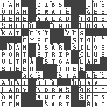 ACROSS 1. Scottish cap 4. Claim 8. Big collection agency 11. Northwest Algerian city 13. Declaim 15. Turn to the right 16. French philosopher Descartes 17. First course 18. Heavy book 19. Scornful expression 21. Working for oneself (abbr.) 22. Greek god of love 23. Krazy ___ of comics 24. Eastern Standard Time (abbr.) 27. Affirmative reply 29. Jane of fiction 30. Fur scarf 34. Daniel's nick name 36. Austrian river, tributary to the Danube 39. Grain storage towers 40. Left side of a ship or aircraft 41. Empty completely 43. A slight indication 44. Extremist 46. Portico 47. Pet locale 48. Guide 49. Woody plant 51. Adept person 53. R.R. building 54. Part of a journey 57. Blind as ____ 60. Beverage made from leaves 63. Break or tear apart 65. Kenny Rogers chart-topper in '80 66. Typical standards 69. Migrant worker of the '30s 70. Single 71. Approach 72. Puts into a specified state 73. Car or cant ending 74. Indian skirt 75. Actress Charlotte DOWN 1. Cod relative 2. Sports stadium 3. French painter Edouard 4. Two (Sp.) 5. Retirement account (abbr.) 6. Indonesian resort city 7. Comedian Laurel of Laurel & Hardy 8. Russian composer Stravinsky 9. San ____ (Riviera town) 10. Perceives with the eye 12. Born 14. Whirlpool 18. One of the two male reproductive glands 20. Marina Del _, California 25. Indian titles of respect 26. Trials 28. Curvy letter 29. Plea 31. Spanish pot 32. Central Nebraska county 33. Compass dir. 34. Dunce 35. Johnson of "Laugh-In" 37. Tate display 38. Debaucheries 40. Festering 42. Role in a play 45. Curve 50. Ewer handle 52. Inactive volcano in Sicily 54. Member of a famous L.A. basketball team 55. Webber/Rice musical 56. Honkers 57. _ vera 58. Object of repulsion 59. Arabian gulf 61. Immeasurably long periods of time 62. Length times width 64. Greek goddess of the dawn 67. Third mo. 68. _ Lanka