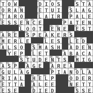 ACROSS 1. Pull behind 4. "Vaya con ____" 8. R.R. building 11. Northwest Algerian city 13. Needle case 14. Volcanic refuse 15. Edible starchy tuberous root 16. Den 17. Diluted with white 18. Center 21. Eucharist need 22. Spoils 23. Compass dir. 25. Eastern Standard Time (abbr.) 26. "We ___ not amused" (Victoria) 29. Orators 32. Haggard of country music 34. French article 35. Directed 38. In addition 39. Box-office sellout 41. An important port of Yemen 43. Slangy assent 44. Allow 45. Phillipine bananalike plant 46. SAT takers 50. Russian fighter aircraft 51. Viper 54. Grow older 55. Length times width 57. Russian prison camp 59. Player piano 63. Monetary unit of Yemen 64. Assist 67. Baltic tributary 68. Singer James 69. Toward shelter 70. Remaining after all deductions 71. Compass dir. 72. Passed on 73. Compass dir. DOWN 1. Carry 2. Mouths or openings 3. Armed conflicts 4. Keyboard key 5. Call ___ day 6. Fr. "Yes" 7. Title for a knight 8. Chalkboard 9. Lies 10. Rep 12. Christmas carol 14. Health resort 19. Olfactory organ 20. Police officer (slang) 21. For each 23. Supplements with great effort 24. Tender 26. Housemaid (var.) 27. Depend 28. Celtic language 30. Having winglike extensions 31. Thick slice 33. Chops off 36. Dutch treat 37. Tenth: prefix 39. A hard, heavy blow 40. Ancient Persian 42. Tired old horse 45. Toward the sea 47. Label 48. Slept 49. Three (prefix) 51. Match 52. Costumes for special activities 53. Food holder 56. At once, immediately (arch.) 58. Chicken ___ king 60. Lyric poems 61. Allows 62. Johnson of "Laugh-In" 64. Possessed 65. Biblical high priest 66. Area sheltered from the wind