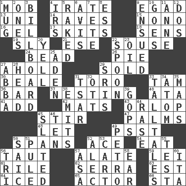 ACROSS 1. Crowd into 4. Feeling or showing extreme anger 9. Mild oath 13. University (slang) 14. All-night dance parties 15. Words to Nanette 16. Set 17. Burlesque acts 18. Elected reps. 19. Secret 21. Compass dir. 22. Boozer 24. Necklace unit 26. Sliced dessert 27. Hold, grip (Informal) 29. Exchanged or delivered for money 30. Memphis, Tenn. Street 31. "Corrida" creature 33. Scottish cap 36. Drinking establishment 37. Inhabiting a nest 40. "One Day ___ Time" 41. Find the sum of 42. Floor protectors 43. Fourth or lowest deck 45. Disorderly outburst 47. Insides of hands 48. Allow 49. Inconspicuous attention getter 50. Connects, as a bridge 52. Adept person 54. Consume 56. Tense 57. Having winglike extensions 59. Flowery wreath 61. Cause heat under the collar 62. Spanish missionary in California 63. Eastern Standard Time (abbr.) 64. On the rocks 65. Thespian 66. R.R. building DOWN 1. Java container 2. Singles 3. Big road sign 4. Big collection agency 5. Swept the length of 6. Deliberation 7. False hair 8. Double-curved letter 9. Took place subsequently 10. Moves 11. Queen of England 1702-14 12. Two (Sp.) 20. Shout 22. Soup utensil 23. Petroleum 25. Arabian gulf 27. Swedish rock group 28. Froth on beer 29. Indian titles of respect 31. Russian ruler of old 32. Baseball player Mel 33. Baron Munchausen's specialties 34. Smallest unit of an element 35. Atlas contents 38. Gives off 39. Republicans 44. Raze (variant) 45. Scheduled 46. "___ Little Indians" 49. Stone: prefix 50. Ketch in the Levant 51. Whimper 52. Actor Baldwin 53. Draw slowly or heavily 55. Trial 56. Three (prefix) 57. White ___ sheet 58. Ewer handle 60. Call ___ day