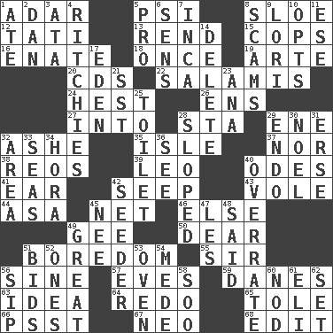 ACROSS 1. The sixth month of the Jewish calendar 5. Air pressure measure (abbr.) 8. A type of plum 12. Jacques of French films 13. Tear apart 15. 911 reaches them 16. Related on the mother's side 18. Single time 19. Johnson of "Laugh-In" 20. Music discs 22. Deli grouping 24. Command 26. Followers of ems 27. To the inside or interior of 28. R.R. building 29. Compass dir. 32. American tennis player Robert 35. Capri or Wight 37. Not either 38. Vintage cars 39. Lion 40. Lyric poems 41. Hearing organ 42. Ooze 43. Grand slam 44. White ___ sheet 45. Fish or hair follower 46. Otherwise 49. Turn to the right 50. Letter starter 51. Mood resulting from idleness 55. Title for a knight 56. Trig term 57. Nights before holidays 59. Natives or inhabitants of Denmark 63. It may be bright or harebrained 64. Redecorate 65. Lacquered or enameled metalware 66. Inconspicuous attention getter 67. Modern: prefix 68. Prepare for publication DOWN 1. Had dinner 2. Daniel's nick name 3. "One Day ___ Time" 4. Actors Guy, Robert Welles, and Clint 5. Adept person 6. Elected reps. 7. South American Indian 8. Fraudulent business schemes 9. Australian parrot (variant) 10. Elects 11. Compass dir. 14. Keyboard key 17. Locale of original sin 21. Fast jet (abbr.) 23. Santa ___, CA 25. Bathroom plumbing fixture 28. Had an oblique or slanted direction 29. Inside; within (prefix) 30. Christmas carol 31. Celtic language 32. Type of rug 33. Oceans 34. Israeli folk dance 36. Observe 40. Make much ado about nothing 42. Sowing specialist 45. Born 47. French article 48. Stated 49. Relatively large 51. Auction offers 52. Washington bills 53. Baking chamber 54. Ancient Persian 56. Small drink 58. "Barney Miller" actor Jack 60. Lower and raise head in agreement 61. Connecticut Ivy Leaguer 62. Arrange properly for use