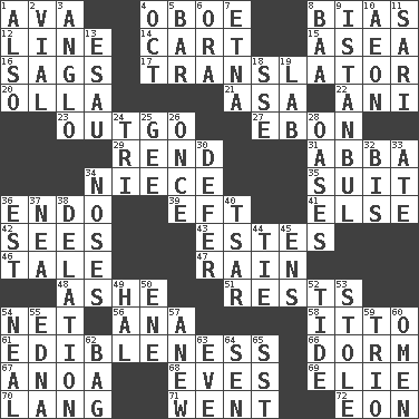 ACROSS 1. Actress Gardner 4. Mitch Miller's instrument 8. Prejudice 12. Actor's bit 14. Haul 15. Toward the sea 16. Droops 17. Interpreter 20. Spanish pot 21. White ___ sheet 22. Black tropical American cuckoo 23. Money paid out 27. Inky black, to poets 29. Tear apart 31. Swedish rock group 34. Sibling's daughter 35. Costume for a special activity 36. Inside; within (prefix) 39. Bank Draft (abbr.) 41. Otherwise 42. Perceives with the eye 43. _____ Park, CO 46. Lie 47. Water falling in drops from the sky 48. American tennis player Robert 51. Musical pauses 54. Fish or hair follower 56. Santa ___, CA 58. "Tell ____ the Marines!" 61. The property of being fit to eat 66. Dormintory (informal) 67. Small Philippine buffalo 68. Nights before holidays 69. Writer Wiesel 70. Long (Scottish) 71. Left 72. Age DOWN 1. In addition 2. Small bottle 3. White American of non-Hispanic descent 4. Sep. follower 5. Tavern 6. Mouth or opening 7. Inactive volcano in Sicily 8. Sound made by sheep 9. Byzantium, centuries later 10. Age 11. Indian skirt 13. He sold his birthright 18. Compass dir. 19. Experiment locale 24. Three (prefix) 25. Turn to the right 26. Single time 28. Fertile tracts in a desert 30. Put off 32. Again 33. Had dinner 34. Olfactory organs 36. Eastern Standard Time (abbr.) 37. Teachers' org. 38. Conveyance 40. Russian ruler of old 44. Make a knot 45. Followers of ems 49. Actor Linden 50. Compass dir. 52. Event that recurs at intervals 53. Took without asking 54. Anneal 55. Pulitzer Prize-winning author Ferber 57. Afresh 59. Musical group of three 60. Sign of things to come 62. Paper or plastic container 63. Night before a holiday 64. Elected rep. 65. Fast jet (abbr.)