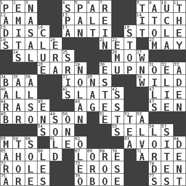 ACROSS 1. Writing instrument 4. Coast Guard woman 8. Tense 12. Nursemaid (var.) 13. Diluted with white 14. Hankering 15. Compact _ 17. Opposed to 18. Took without asking 19. Showing deterioration from age 21. Fish or hair follower 23. Fifth month 24. Runs notes together 26. Cut the grass 28. Merit 30. Normal relaxed breathing 34. Sound made by sheep 37. Charged atoms 39. Uncontrolled 40. 100% 41. Narrow boards 43. Whopper 44. To erase 46. Eons 47. Elected rep. 48. "Death Wish" actor 51. Singer James 54. Male offspring 55. Makes a sale 58. Mountains (abbr.) 61. Lion 63. Stay clear from 65. Hold, grip (Informal) 67. Old wives' tales, e.g. 71. Johnson of "Laugh-In" 72. Hero or heavy, e.g. 73. Greek god of love 74. Lair 75. Ancient Greek god of war 76. Mitch Miller's instrument 77. Fast jet (abbr.) DOWN 1. Groovy apts. 2. Sends forth 3. Relating to the nose 4. Health resort 5. Baking dish 6. The first octave above the treble staff 7. It's straight from the horse's mouth 8. Teat (slang) 9. Tiny particle 10. Southern CA. univ. 11. Those things 16. A slight indication 18. Cease 20. Period 22. Australian flightless bird 25. Indian titles of respect 27. Compass dir. 29. Pitcher Ryan 30. First name in cosmetics 31. Petroleums 32. Writer Wiesel 33. Arabian gulf 34. Sharp remark 35. Having or resembling wings 36. In addition 38. Tired old horse 42. Fast planes 45. Followers of ems 49. Disposed of to a purchaser 50. Single 52. Afternoon social gathering 53. Inventor's middle name 56. Domineers 57. Settings 58. Hindu Mythology: god of death 59. Son of Odin 60. Flatfish 62. Margarine 64. Gouge 66. French article 68. Globe 69. Friend of Pooh 70. Compass dir.