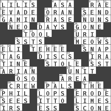 ACROSS 1. Ms. Damita and namesakes 6. White ___ sheet 9. Actress Charlotte 12. Elude 13. Northwest Algerian city 14. Transmit 15. Homeless child 16. Raze (variant) 17. Religious women 18. Modern: prefix 19. 24-hour periods 20. Went 21. Utensil 23. RI univ. 24. Fast planes 25. Catcalls? 28. Biblical high priest 30. Giggle 34. Fastener 35. Label 36. Flat circles 38. Lyricist Gershwin 39. Prong on a fork 41. Fur scarf 43. Fast jet (abbr.) 44. Believer in; advocate of (suffix) 46. A single undivided whole 48. Bear (Spanish) 49. Length times width 50. Ship's personnel 51. Friends 53. Definite Article 56. Silvers or Donahue 57. Chops off 58. Wear away 60. Perceives with the eye 61. "Tell ____ the Marines!" 62. Citrus fruits 63. Big collection agency 64. Curvy letter 65. Biscuitlike quick bread DOWN 1. Part of a journey 2. "Terrible" tsar 3. Unable to walk 4. Foolish or stupid persons 5. Elected rep. 6. Like ___ of sunshine 7. Backtalk 8. One (Scot) 9. One who advocates reunion 10. Singer Murray 11. Begley and Asner 13. Spoken 14. Sounds asleep 19. Administered medicine 20. Chewing product 22. Baseball player Mel 24. Seigniories (variant) 26. Armed conflicts 27. Petty quarrel 28. Singer James 29. Den 31. Part of HMS, perhaps 32. Eastern Standard Time (abbr.) 33. Environmental prefix 37. Runs notes together 40. Artist's stands 42. Compass dir. 45. At this time 47. Of or pertaining to medicine 49. In addition 50. "Mermaids" star 51. Cooking vessels 52. Flats, for short 54. Same (prefix) 55. Locale of original sin 56. Air pressure measure (abbr.) 57. Whopper 58. Raised railways 59. Compass dir.