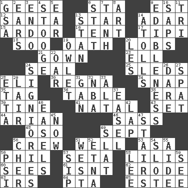 ACROSS 1. Honkers 6. R.R. building 9. Eastern Standard Time (abbr.) 12. Before Barbara or Clara 13. Play the lead 14. The sixth month of the Jewish calendar 15. Zeal 16. Portable shelter 17. Native american tent (variation) 18. "Barney Miller" actor Jack 19. Pledge 20. Tennis shots 21. Long dress 23. Pipe bend 24. Lick closed 25. Bobsleighs 28. Biblical high priest 30. Rain (Swedish) 34. Fastener 35. Label 36. Eating place 38. Period 39. Prong on a fork 41. Relating to or accompanying birth 43. Put into a specified state 44. Believer in; advocate of (suffix) 46. Backtalk 48. Bear (Spanish) 49. Back-to-school mo. 50. Ship's personnel 51. Not ill 53. White ___ sheet 56. Silvers or Donahue 57. Bristle 58. Ms. Damita and namesakes 60. Observes 61. Is not 62. Eat (away) 63. Big collection agency 64. Parent Teacher Assoc. 65. First name in cosmetics DOWN 1. Girls' org. (abbr.) 2. Hearing organs 3. Inside; within (prefix) 4. Moe Howard, for one 5. Hearing organ 6. Proofreading order 7. Hyperbolic tangent 8. Nonscientific branch of learning 9. The property of being fit to eat 10. Plant excrements 11. Three (prefix) 13. Comedian Laurel of Laurel & Hardy 14. Ringlike coral islands and reefs 19. A small or young owl 20. French article 22. Rowing implement 24. Seigniories (variant) 26. Have the gumption 27. Petty quarrel 28. Singer James 29. Den 31. Separate the seeds from cotton 32. Basketball assoc. 33. Keyboard modifier key 37. Artist's stand 40. Artist's stands 42. Pet locale 45. Immediately 47. Flight of steps 49. Narrow board 50. "Mermaids" star 51. 270 degrees 52. Inactive volcano in Sicily 54. Narrow opening 55. Helper 56. 23rd letter of the Greek alphabet 57. Small drink 58. Area sheltered from the wind 59. Perceive with the eye