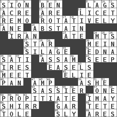 ACROSS 1. The Jewish people; Israel 5. Benjamin's nick name 8. Straggles 12. 1/640 square mile 13. "We ___ not amused" (Victoria) 14. It is permitted: Lat. 15. San ____ (Riviera town) 16. Happening in regular succession 19. A saturated hydrocarbon 20. Refrain by choice 21. SW Asia republic 23. Had dinner 24. Mountains (abbr.) 27. Play the lead 30. Count _ (2 wds.) 31. Fodder prepared in a silo 34. Pulitzer Prize-winning author Ferber 35. Suttee (variant) 38. Indian state 40. Ooze 41. Angers 42. Artist's stands 44. Rendezvous 45. Writer Wiesel 46. Baking dish 47. Electrical Unit 50. American tennis player Robert 53. More lively and spirited 57. Single 59. Conciliate 63. "If ____ say so..." 64. Bake eggs in their shells 65. Slender fish 66. False hair 67. Lacquered or enameled metalware 68. Playfully artful 69. Ancient Greek god of war DOWN 1. "Two Mules for Sister ____" 2. Ancient Celtic tribe of eastern Britain 3. Channel Islands abalone 4. Modern: prefix 5. Sharp remark 6. Greek god of love 7. Remaining after all deductions 8. 54 in ancient Rome 9. Adept person 10. Set 11. Filthy place 14. Actor's bit 17. American Automobile Association (abbr.) 18. Teat (slang) 20. Opposed to 22. Aid 24. Ancient Persian 25. Prong on a fork 26. Fastener 28. Wing 29. Raze (variant) 30. Makes clutter 32. Girls' org. (abbr.) 33. Comfort 35. Simple or foolish person 36. Type of rug 37. Adolescent 39. Cartoonist voice _ Blanc 43. One who doesn't tell the truth 47. SW Saudi Arabia district 48. Floor covering 49. Air pressure measure (abbr.) 51. Baseball hit which scores a run 52. Related on the mother's side 54. Droops 55. Slanted text style (abbr.) 56. Suggestive of the supernatural 58. Snake ____ (dice throw) 59. Pacific Standard Time (abbr.) 60. 17th letter of the Greek alphabet 61. Lubricate 62. Before (prefix) 63. Call ___ day