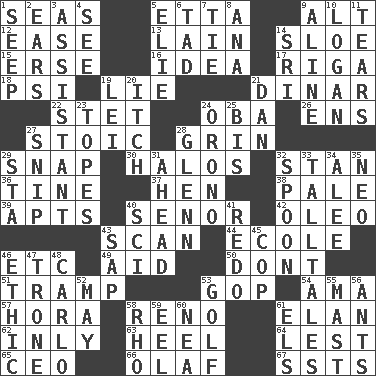 ACROSS 1. Oceans 5. Singer James 9. Keyboard modifier key 12. Relaxation 13. (Had) reclined 14. _ gin 15. Celtic language 16. It may be bright or harebrained 17. Capital of Latvia 18. Air pressure measure (abbr.) 19. Untruth 21. Middle Eastern gold or silver currency 22. Proofreading order 24. Chief or king in Benin or Nigeria 26. Followers of ems 27. Unemotional 28. Amused look 29. Fastener 30. Auras 32. Comedian Laurel of Laurel & Hardy 36. Prong on a fork 37. Layer 38. Diluted with white 39. Flats, for short 40. Sir (Sp.) 42. Margarine 43. Examine hastily 44. Learning spot: Fr. 46. And so on (abbr.) 49. Help 50. Do not 51. _____ steamer (cargo ship) 53. Grand Old Party 54. Nursemaid (var.) 57. Israeli folk dance 58. Former U.S. Attorney General Janet 61. Liveliness 62. In an inward manner 63. Person who is morally reprehensible 64. For fear that 65. Corporate head (abbr.) 66. Norwegian king 67. Fast planes DOWN 1. Ooze 2. Hearing organs 3. Helper 4. Perceive with the eye 5. Writer Wiesel 6. Small amount or degree 7. Standoff 8. Santa ___, CA 9. Place in a line 10. Utah city north of Ogden 11. Rends 14. Indian title of respect (Mr.) 19. Luau accessory 20. Hankering 21. Daniel's nick name 23. Drinks excessively 24. U. of Maine site 25. Altar cloth linen 27. Sever or remove by pinching or nipping 28. American astronaut and politician John 29. R.R. building 31. At or in the front 32. Soup utensil 33. Baron Munchausen's specialties 34. Toward shelter 35. Modern: prefix 40. _-fi 41. Redecorate 43. Plant excrement 45. Police officer (slang) 46. Moral principle 47. Heavy duty weighing machine 48. Monte _, Las Vegas Hotel/Casino 52. Can I? 53. _ course 55. Vertical spar for supporting sails 56. Pismires 58. 17th letter of the Greek alphabet 59. Snakelike fish 60. Teachers' org. 61. Raised railways