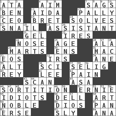 ACROSS 1. _ moment's notice (2 wds.) 4. Direct toward a target or goal 7. Sinks 11. Benjamin's nick name 12. Opera by Verdi 13. Friendly 14. Corporate head (abbr.) 15. Cy Young winner Saberhagen 16. Finds the solution 17. Slow-paced one 19. Aide 21. Set 23. Angers 24. Olfactory organ 25. Grow older 26. Insect wing 29. Shops 30. Followers of ems 31. Big _ 32. Greek goddess of the dawn 33. Big collection agency 34. A saturated hydrocarbon 35. Keyboard modifier key 36. _-fi 37. Major League Baseball Commissioner Bud 40. Marina Del _, California 41. Area sheltered from the wind 42. Ache 43. Glance over 45. White ___ sheet 46. Casting lots 51. Bert's buddy 55. Foolish or stupid persons 56. Small valley 58. Tate display 59. Having high moral qualities 60. "Vaya con ____" 61. Baking dish 62. Celtic language 63. Stealthy 64. Santa ___, CA DOWN 1. Lettered men learn these first 2. Adolescent 3. Small Philippine buffalo 4. Wind 5. The main thing one is thinking about 6. Floor coverings 7. Table seasonings 8. Inventor's middle name 9. Small, secluded valley 10. System (abbr.) 12. Most capable 13. Introduce or present, as a question 16. Begets 18. Russian composer Stravinsky 20. Public displays of written messages 22. French article 24. Difficult 25. Nest on high 26. With great haste 27. Long (Scottish) 28. Adept person 29. Undercover agent 32. Ewer handle 33. Ancient Celtic tribe of eastern Britain 36. Narrow boards 37. Health resort 38. Artist's stands 39. One who doesn't tell the truth 43. Fur scarf 44. Quote 46. Trig term 47. Aroma 48. Chest bones 49. Likelihood 50. Famous astronaut Armstrong 52. California wine valley 53. SW Asia republic 54. Inactive volcano in Sicily 57. Myrna of the movies