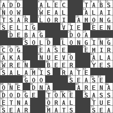ACROSS 1. Find the sum of 4. Actor Baldwin 8. Bar bills 12. Immediately 13. Welt 14. Jai _ 15. Russian ruler of old 17. Australian parrot (variant) 18. Amid 19. Major League Baseball Commissioner Bud 21. Compete 23. Car or cant ending 24. Debunk (Brit. slang) 26. ___ good deed 28. Disposed of to a purchaser 30. Yearning 34. Gear tooth 37. Relaxation 39. Arab leader 40. Alias (abbr.) 41. New (sp.) 43. Insect wing 44. Songbird 46. Fermented drink made from hops 47. Affirmative reply 48. Deli grouping 51. Pace 54. Thick or sticky substance 55. Gospel singer Marvin 58. Single 61. Heredity factor (abbr.) 63. Sports stadium 65. Evade 67. Puff or smoke 71. Backtalk 72. Inactive volcano in Sicily 73. Taken by mouth 74. Third day of the wk. 75. Shrivel 76. Floor coverings 77. Ocean DOWN 1. Pismires 2. Administered medicine 3. A sleeping potion; an opiate (poet.) 4. Leather borer 5. Lion 6. Hearing organ 7. 154 in Roman numerals 8. Scottish cap 9. Medicinal plant 10. Object of repulsion 11. Attach a signature 16. Chest bones 18. A really long time 20. E Mali city 22. Wedding promise 25. Small, secluded valley 27. Grow older 29. Applies to a surface 30. Crowbar 31. "If ____ say so..." 32. Mediterranean tributary 33. Pate de foie ____ 34. Crow sounds 35. Gumbo ingredient 36. Highlander 38. Observe 42. Mouths or openings 45. Tired old horse 49. Method 50. Electrically charged atom 52. Beverage made from leaves 53. Hearing organs 56. Theater features 57. Take place subsequently 58. Lyric poems 59. Make mention of 60. Pulitzer Prize-winning author Ferber 62. Smallest unit of an element 64. Toward the sea 66. Slender fish 68. Mouth or opening 69. Krazy ___ of comics 70. Raised railways
