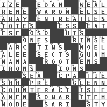ACROSS 1. Ending with capital 4. Dutch treat 8. Welt 12. French philosopher Descartes 14. Make _____ (do battle with) 16. Otherwise 17. Like ___ of sunshine 18. Pleas 20. Hauls 22. Double-curved letter 23. Ingest 24. Compass dir. 25. Bear (Spanish) 28. Part of HMS, perhaps 30. Washington bills 31. Remove soap 35. Curve 37. Metal containers 40. Christmas carol 41. Toward shelter 42. Religious groups 44. Island territory of the United States 45. Nanny 46. Carrot, for example 47. Followers of ems 48. Metal shackles 50. Charged particles 52. Ocean 54. Numbers guy (abbr.) 55. Standoff 58. Quiet! 61. Before (prefix) 63. American astronaut and politician John 65. Neutralize 70. Small island 71. So be it 72. Underwater navigation system 73. A distinct part 74. Thickened enlargement 75. Indian skirt 76. Filthy place DOWN 1. Feeling or showing extreme anger 2. Nothings 3. Related on the mother's side 4. She-sheep 5. One of the 12 tribes of Israel 6. Nonscientific branch of learning 7. Greater amount 8. Soggy 9. Writer Wiesel 10. Toward the sea 11. For fear that 13. Sight organ 15. Delicate 19. SW Saudi Arabia district 21. Male offspring 26. Arranges properly for use 27. Flexible twig of a willow tree 29. Burns superficially 30. Seas 32. Part of speech 33. Oceans 34. Shade tree 35. Having or resembling wings 36. Former U.S. Attorney General Janet 38. Non-commissioned officer (abbr.) 39. Unemotional 41. Cuckoo 43. Halt 49. Back-to-school mo. 51. Tired old horse 53. Ancient Greek god of war 55. Trials 56. An arm off of a larger body of water 57. Foe 58. Skim 59. Like (prefix) 60. Took on color 62. Greek god of love 64. Cards in a Roman deck? 66. Compass dir. 67. Santa ___, CA 68. 4-wheeled motor vehicle 69. Three (prefix)