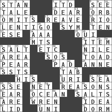 ACROSS 1. Comedian Laurel of Laurel & Hardy 5. It would 8. Perceive with the eye 11. Falsehood 12. Letter starter 14. Globe 15. Leaves out 17. Rob, plunder, or pillage 18. River (Sp.) 19. Small, flat, pigmented spot on the skin 21. Symbol (abbr.) 22. Nine, plus one 23. Compass dir. 24. Auto club (abbr.) 25. Fr. "Yes" 27. Mountains (abbr.) 28. A distinct part 31. Table seasoning 35. And so on (abbr.) 37. "Death on the ____" 38. Length times width 39. Distress signal 41. Frog relative 42. Lightbulb-shaped fruit 43. Groovy apt. 45. Queen of England 1702-14 46. Fast planes 47. Keyboard key 49. Part of HMS, perhaps 51. RI univ. 52. Ocean 55. Compass dir. 57. Fish or hair follower 60. Thinks logically 62. Hearing organ 63. Sea 65. Table seasonings 66. "We ___ not amused" (Victoria) 67. Songbird 68. It may be bright or harebrained 69. Hat (slang) 70. Corn or form start 71. Dormintory (informal) DOWN 1. Fur scarf 2. Domesticates 3. Place in a line 4. Remaining after all deductions 5. Binary compound 6. Beverages made from leaves 7. _ Jones' Locker 8. Casting lots 9. 4th largest of the Great Lakes 10. Inky black, to poets 13. San ____ (Riviera town) 16. Thailand, formerly 17. Exposes to great heat 20. Yard entry 26. National forest in Provo, Utah 29. Liveliness 30. Ancient Persian 31. Plant excrements 32. Ancient Greek god of war 33. Resembling or made to resemble leather 34. Tarsus (plural) 36. Police officer (slang) 40. Titan orbits this 44. Have the gumption 48. Prejudice 50. Frozen precipitation 52. Twentieth part of a lira 53. Keyboard key 54. Indian state 55. Lick closed 56. Indian skirt 58. Shade of tan 59. Adolescent 61. Stated 64. Cuckoo