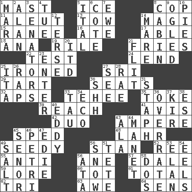 ACROSS 1. Vertical spar for supporting sails 5. Frozen water 8. Police officer (slang) 11. Native American of Southwest Alaska 13. Pull behind 14. Wise men 15. Indian princess (variant) 16. Had dinner 17. Competent 18. Santa ___, CA 19. Cause heat under the collar 21. Strips of potato fried in deep fat 22. Trial 24. Grant temporary use of 25. Pressed 27. Indian title of respect (Mr.) 29. Small pie 30. Theater features 32. Domed church section 33. Giggle 35. Casino tip 39. Arrive at 41. Deliberation 42. Superhero pair 43. Electrical Unit 45. Moved rapidly 48. Cowardly lion portrayer 49. Morally degraded 50. Comedian Laurel of Laurel & Hardy 52. To sift 55. Against 56. One (Scot) 57. Peak District village in England 59. Old wives' tales, e.g. 60. Small child 61. Add up to 62. Three (prefix) 63. Deep reverence 64. Elected reps. DOWN 1. Hindu Mythology: god of death 2. Actor Alda or Thicke 3. Legislators 4. Third day of the wk. 5. Slanted text style (abbr.) 6. ____ d'Azur (French Riviera) 7. She-sheep 8. Apartment or room in a ship 9. Stared 10. Sliced desserts 12. Laconic 14. Female horse 20. It would 21. Sudden quick movement 23. Keyboard key 25. Call ___ day 26. Reproach for some lapse or misdeed 27. Observe 28. Actress Charlotte 30. Quiet! 31. Staphylococcus 33. The 19th letter of the Greek alphabet 34. Environmental prefix 36. Make much ado about nothing 37. Apertif with cassis 38. Compass dir. 40. Whirlpool 43. According to 44. French painter Edouard 45. Sir (Sp.) 46. _ dish (used to culture cells) 47. Singer Brickell 49. Table seasoning 50. Frozen precipitation 51. Wig 53. Liveliness 54. Snakelike fish 56. _ moment's notice (2 wds.) 58. Two (Sp.)