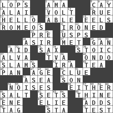 ACROSS 1. Chops off 5. Nursemaid (var.) 8. Island 11. Jai _ 12. Electrical Unit 14. Regret 15. Phone greeting 17. Competent 18. Snakelike fish 19. Lover boys 21. Pressed 23. Before (prefix) 25. United States Postal Service (abbr.) 26. SW Saudi Arabia district 27. Was introduced to 28. Separate the seeds from cotton 31. Assist 33. Saxophone 35. Unemotional 37. Inventor's middle name 38. Federal power corp. 40. Southwest Nigerian state 41. Criticizes harshly 43. Retirement account (abbr.) 45. Afternoon social gathering 46. Baking dish 47. Personal question 50. A slight indication 52. At sea 53. Male offspring 54. Annoying sounds 56. One or the other 61. Table seasoning 62. Puts into a specified state 65. One or ones belonging to thee 66. Compass dir. 67. Writer Wiesel 68. Does sums 69. Label 70. R.R. building 71. Trial DOWN 1. Cowardly lion portrayer 2. Butter sub 3. Inside of hand 4. Drop; flow; fall 5. Actress Gardner 6. Crowd into 7. Plant genus of onion and garlic 8. Algonquian 9. Old (Scot.) 10. Affirmative reply 13. Laconic 16. I made a mistake 18. Followers of ems 20. Indian titles of respect 22. Elects 24. Part of Q.E.F. 26. First of billions? 28. Went 29. Opera by Verdi 30. Non-commissioned officer (abbr.) 31. Silent film actress Nazimova 32. _ the terrible 34. 16 36. Carryall 37. Viper 39. Arches 42. Backtalk 44. _ vera 48. Honkers 49. Artist's stands 51. A single undivided whole 52. Small island 54. Grandmother 55. Cassini of fashion 57. Not this but _ 58. Flintstone garb 59. Conclusions 60. Relief 61. Arrange properly for use 63. Teat (slang) 64. Ocean
