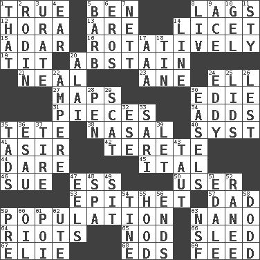 ACROSS 1. Loyal 5. Benjamin's nick name 8. Falls behind 12. Israeli folk dance 13. "We ___ not amused" (Victoria) 14. It is permitted: Lat. 15. The sixth month of the Jewish calendar 16. Rotating or pertaining to rotation 19. Teat (slang) 20. Choose not to consume 21. Anneal 23. A saturated hydrocarbon 24. Pipe bend 27. Atlas contents 30. Singer Brickell 31. Components 34. Does sums 35. False hair 38. Rhinal 40. System (abbr.) 41. SW Saudi Arabia district 42. Cylindrical with tapered ends 44. Have the gumption 45. Slanted text style (abbr.) 46. Institute legal proceedings 47. Double-curved letter 50. One who uses or employs something 53. Curse 57. Male parent 59. Census information 63. Billionth: prefix 64. Debaucheries 65. Lower and raise head in agreement 66. Downhill vehicle 67. Writer Wiesel 68. Begley and Asner 69. Nourish DOWN 1. Not this but _ 2. "The Thinker" sculptor 3. A salt of uric acid 4. Hearing organ 5. Sharp remark 6. Greek god of love 7. Remaining after all deductions 8. 54 in ancient Rome 9. Adept person 10. Set 11. Filthy place 14. Actor's bit 17. American Automobile Association (abbr.) 18. Shallow baking pan 20. Jai ____ 22. Electrical Unit 24. Whirlpool 25. Flaplike coverings 26. For fear that 28. Animal enclosure 29. Scram! 30. Artist's stands 32. Compass dir. 33. Indian skirt 35. Small amounts or degrees 36. Son of Isaac 37. Become fatigued 39. Allow 43. Drawn tight 47. Snakelike fish 48. Health resort 49. Be seated 51. Peak District village in England 52. The wife of a rajah (variant) 54. Prong on a fork 55. Parka part 56. Extremities 58. Texas town _ City 59. Before (prefix) 60. Petroleum 61. Luau course 62. Shoshoni 63. Science/research agcy.