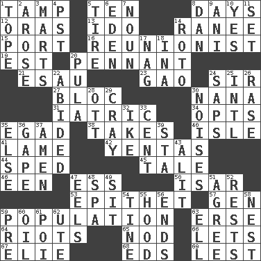 ACROSS 1. Pack (down) 5. Nine, plus one 8. 24-hour periods 12. Mouths or openings 13. Wedding promise 14. Indian princess (variant) 15. Left side of a ship or aircraft 16. One who advocates reunion 19. Eastern Standard Time (abbr.) 20. Pre-World Series prize 21. He sold his birthright 23. E Mali city 24. Title for a knight 27. Coalition 30. Nanny 31. Of or pertaining to medicine 34. Chooses 35. Mild oath 38. Receives possession of 40. Capri or Wight 41. Unable to walk 42. Gossips 44. Hurried 45. Story 46. Car or cant ending 47. Double-curved letter 50. Austrian river, tributary to the Danube 53. Curse 57. Commissioned military rank (abbr.) 59. Census information 63. Celtic language 64. Debaucheries 65. Dreamland 66. Allows 67. Writer Wiesel 68. Begley and Asner 69. For fear that DOWN 1. Drink excessively 2. Came up 3. Shops 4. Pacific Standard Time (abbr.) 5. Become fatigued 6. Paradise 7. Part of speech 8. One of the 12 tribes of Israel 9. Cuckoo 10. It is so 11. Put into a specified state 14. Printing process, for short 17. Tired old horse 18. _ tizzy (2 wds.) 20. Monetary unit of Botswana 22. Remained 24. Plant excrements 25. International (abbr.) 26. To erase 28. Baseball player Mel 29. Supercomputer manufacturer 30. Annoying sounds 32. D.D.E's nickname 33. Penny 35. Otherwise 36. Yawn 37. So be it 39. R.R. building 43. Set down 47. Snakelike fish 48. Health resort 49. Be seated 51. Match 52. Musical pauses 54. Prong on a fork 55. Parka part 56. Extremities 58. A home for chicks 59. Before (prefix) 60. Lubricate 61. Luau course 62. Shoshoni 63. Pipe bend