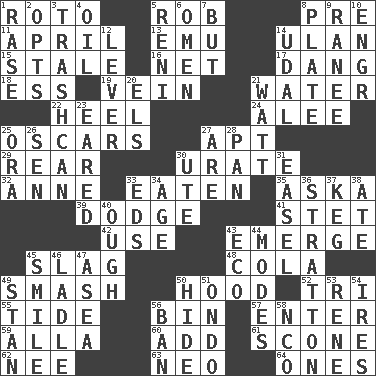 ACROSS 1. Printing process, for short 5. Director Reiner 8. Before (prefix) 11. Showery time 13. Australian flightless bird 14. ____ Bator, Mongolia 15. Lacking originality or spontaneity 16. Fish or hair follower 17. Mild oath, euphamism for damn 18. Curvy letter 19. Distinctive style or manner 21. Wetness 22. Person who is morally reprehensible 24. Toward shelter 25. Motion picture awards 27. Fitting 29. Located in or toward the back 30. A salt of uric acid 32. Singer Murray 33. Ingested 35. "____ silly question..." 39. Evade 41. Proofreading order 42. Purpose 43. Develop 45. Volcanic refuse 48. Root beer relative 49. Box-office sellout 50. Parka part 52. Three (prefix) 55. Periodic rise and fall of the sea level 56. Storage container 57. Keyboard key 59. Silent film actress Nazimova 60. Find the sum of 61. Biscuitlike quick bread 62. Born 63. Modern: prefix 64. Singles DOWN 1. To erase 2. Elects 3. File 13 4. Petroleum 5. Painter Guido (1575-1642) 6. Sign of things to come 7. On the contrary 8. Food holder 9. The wife of a rajah (variant) 10. Engineer (abbr.) 12. Prying instrument 14. Hereditary estate 20. Raised railways 21. Electrical Unit 23. Having ears or earlike features 25. Mouth or opening 26. Elected rep. 27. "We ___ not amused" (Victoria) 28. Baking dish 30. Shoshoni 31. Artist's stand 33. Begley and Asner 34. Mature 36. Ski resort town in Vermont 37. Cask 38. Had dinner 40. Ending for "Through" and "Enough" 43. Environmental prefix 44. Methods 45. Grin 46. Dipping utensil 47. At sea 49. Comedian Laurel of Laurel & Hardy 50. Flintstone garb 51. Southwest Nigerian state 53. French philosopher Descartes 54. Angers 56. Forbid 58. Non-commissioned officer (abbr.)