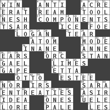 ACROSS 1. Acquire through effort 4. Opposed to 8. Measure of real estate 12. Part of Q.E.F. 14. 480, 500 or 516 sheets of paper 15. Implement 16. Soft 17. Pieces 20. Russian ruler of old 21. Frozen water 22. Enemy 23. Utah city north of Ogden 27. Lacerate 29. Tiny particle 31. Method 34. Empty; void 35. Singer Murray 36. Hearing organs 39. The grampus (Milton) 41. Comedian Laurel of Laurel & Hardy 42. Highlander 43. Citrus fruits 46. Yawn 47. Singer James 48. "Beetle Bailey" pooch 51. First name in cosmetics 54. Or not 56. Big collection agency 58. "Two Mules for Sister ____" 61. Pleas 66. SW Saudi Arabia district 67. The main thing one is thinking about 68. Singles 69. Ubangi River tributary 70. Old wives' tales, e.g. 71. Light colored 72. French article DOWN 1. Left 2. Angers 3. Rhinal 4. Curve 5. Modern: prefix 6. Scottish cap 7. Body of Kaffir warriors 8. Had dinner 9. Meet 10. Printing process, for short 11. Otherwise 13. Through, poetically 18. Sep. follower 19. Born 24. Separate the seeds from cotton 25. "One Day ___ Time" 26. Words to Nanette 28. Collect or gather 30. Haggard of country music 32. Heredity factor (abbr.) 33. Car or cant ending 34. Small island 36. Oval reproductive body of a fowl 37. Auto club (abbr.) 38. Newsperson 40. Quote 44. Mountains (abbr.) 45. Erode 49. Make a knot 50. Mouth or opening 52. He sold his birthright 53. Artist's stand 54. Famous astronaut Armstrong 55. Southwest Nigerian state 57. Obstruct or block passage 59. Cause heat under the collar 60. Ancient Greek god of war 62. Actress Charlotte 63. _ tizzy (2 wds.) 64. Snakelike fish 65. Compass dir.