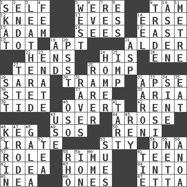 ACROSS 1. Oneself 5. Past tense of be (plural) 9. Scottish cap 12. Leg joint 13. Nights before holidays 14. Celtic language 15. First of billions? 16. Observes 17. Compass direction 18. Small child 19. Fitting 21. Tree or shrub in the Birch family 22. Coop moms 24. Part of HMS, perhaps 26. Compass dir. 27. Looks after 28. Play 29. "Two Mules for Sister ____" 30. _____ steamer (cargo ship) 32. Domed church section 36. Proofreading order 37. "We ___ not amused" (Victoria) 38. Roberta Peters solo 39. Event that recurs at intervals 40. Unconcealed 42. Monthly bill 43. One who makes use of a thing 44. Came up 46. Barrel 49. Mayday 50. Painter Guido (1575-1642) 51. Feeling or showing extreme anger 53. Filthy place 54. Heredity factor (abbr.) 57. Hero or heavy, e.g. 58. Tall New Zealand timber tree 61. Adolescent 62. The main thing one is thinking about 63. Dwelling 64. To the inside or interior of 65. Teachers' org. 66. Washington bills 67. Singer James DOWN 1. Three-handed card game 2. Inside; within (prefix) 3. Tough but pliablecoriaceous 4. Opposite of masc. 5. 270 degrees 6. Night before a holiday 7. Portuguese money of account (variant) 8. Double-curved letter 9. Swap 10. NE Netherlands city 11. Distance measurement (Brit.) 14. Snakelike fish 19. Added to 20. Inconspicuous attention getter 21. Viper 23. Related on the mother's side 24. Homing pigeon 25. Mischievous child 27. Jacques of French films 28. More valued for its uncommonness 29. Fast jet (abbr.) 31. All-night dance parties 32. Composer Copland 33. Elected leader of a country 34. Trig term 35. Consume 40. Bear (Spanish) 41. Small pie 43. Purpose 45. Marina Del _, California 46. Japanese brewing company 47. Eat (away) 48. An organ shaped like a helmet 52. Beverage made from leaves 53. Institutes legal proceedings 55. Remaining after all deductions 56. Small Philippine buffalo 58. 17th letter of the Greek alphabet 59. Electrically charged atom 60. Madame (abbr.) 61. Neckwear