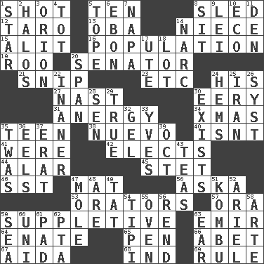 ACROSS 1. Attempt 5. "___ Little Indians" 8. Downhill vehicle 12. Pacific island yam 13. Chief or king in Benin or Nigeria 14. Sibling's daughter 15. Set down 16. Census information 19. Friend of Pooh 20. Legislator 21. Clip 23. And so on (abbr.) 24. Part of HMS, perhaps 27. Political cartoonist Thomas 30. Suggestive of the supernatural 31. Disorder of the immune system 34. Dec. holiday 35. Adolescent 38. New (sp.) 40. Is not 41. Past tense of be (plural) 42. Chooses 44. Having or resembling wings 45. Proofreading order 46. Fast jet (abbr.) 47. Floor covering 50. "____ silly question..." 53. Speakers 57. Mouth or opening 59. Supplementary 63. Arab leader 64. Maternal 65. Fenced enclosure 66. Collude with 67. Opera by Verdi 68. Working for oneself (abbr.) 69. General guideline DOWN 1. Play the lead 2. Radiant circles of light 3. Constellation of myth 4. Small child 5. Drink excessively 6. Inky black, to poets 7. California wine valley 8. Be seated 9. Flowery wreath 10. Environmental prefix 11. Lair 14. Drug cop 17. Shoshoni 18. Car dealer's back yard 20. Connect, as a bridge 22. Sillier 24. Folds over and sews together 25. SW Asia republic 26. System (abbr.) 28. Elected rep. 29. Loyal 30. Is 32. Set 33. Jacques Cousteau's middle name 35. It was, poetically 36. Snakelike fish 37. Part of Q.E.F. 39. Sep. follower 43. Beverages made from leaves 47. Undercover agent 48. "We ___ not amused" (Victoria) 49. Make lace 51. Dried seaweed eaten as food 52. Satellite of Uranus 54. Native american tent (variation) 55. Baking chamber 56. Tear apart 58. Johnson of "Laugh-In" 59. Ocean 60. University (slang) 61. Groovy apt. 62. Parent Teacher Association (abbr.) 63. Hearing organ