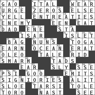 ACROSS 1. E Mali city 4. Slanted text style (abbr.) 8. Erode 12. Goad 14. Nothings 16. Otherwise 17. Shout 18. Pleas 20. Foe 22. Car or cant ending 23. Ingest 24. June honoree 25. Compass dir. 28. R.R. building 30. Austrian river, tributary to the Danube 31. Small island 35. Container for groceries 37. Religious women 40. Ancient Roman robe 41. Merit 42. Sea 44. Part of Q.E.F. 45. Margarine 46. Falsehood 47. To free from 48. Excessive but superficial compliments 50. Small amounts or degrees 52. Hearing organ 54. Secret 55. Compass dir. 58. 23rd letter of the Greek alphabet 61. Thick or sticky substance 63. Sends forth 65. Seigniories (variant) 70. Came down and settled, as after flight 71. _ gin 72. Tarsus (plural) 73. Lacquered or enameled metalware 74. "Corrida" creature 75. Political cartoonist Thomas 76. Perceive with the eye DOWN 1. Ridiculed 2. Sports stadium 3. Stared at amorously 4. Ending with capital 5. Nine, plus one 6. Nonscientific branch of learning 7. Old wives' tales, e.g. 8. Soggy 9. Writer Wiesel 10. At sea 11. Repose 13. Shade tree 15. Observes 19. Opposed to 21. It is so 26. Billionth: prefix 27. Spew [out] 29. Michaelmas daisies 30. Snub 32. Australian parrot (variant) 33. Mild oath 34. Make lace 35. Lip ointment 36. Type of rug 38. Teachers' org. 39. Table seasonings 41. Greek goddess of the dawn 43. Anneal 49. Wise men 51. Color 53. Carrot, for example 55. Grain storage towers 56. Vertical member of a panel or frame 57. First name in cosmetics 58. Inconspicuous attention getter 59. Grain storage tower 60. Composer Stravinsky 62. Northwest Algerian city 64. Floor covering 66. Modern: prefix 67. Lyricist Gershwin 68. Curvy letter 69. Be seated
