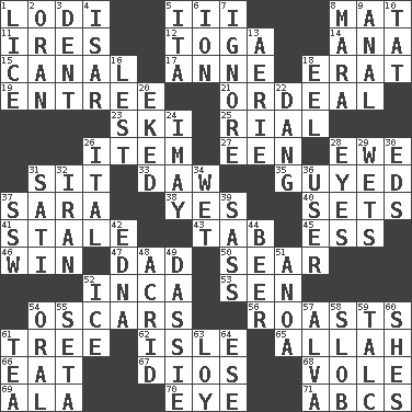 ACROSS 1. Farming town in central California 5. One more than two 8. Floor protector 11. Angers 12. Ancient Roman robe 14. Santa ___, CA 15. Lessep's creation 17. Queen of England 1702-14 18. Part of Q.E.F. 19. Main course 21. Severe or trying experience 23. What Jean-Claude Killy likes to do 25. Monetary unit of Yemen 26. A distinct part 27. Car or cant ending 28. She-sheep 31. Be seated 33. Obsolete 35. Ridiculed 37. "Two Mules for Sister ____" 38. Affirmative reply 40. Arranges properly for use 41. Lacking originality or spontaneity 43. Keyboard key 45. Curvy letter 46. Acquire through effort 47. June honoree 50. Wither 52. South American Indian 53. Elected rep. 54. Motion picture awards 56. Ridicules or criticizes harshly 61. Woody plant 62. Small island 65. Assad's deity 66. Erode 67. "Vaya con ____" 68. Grand slam 69. In the manner of 70. Sight organ 71. Lettered men learn these first DOWN 1. Louse (plural) 2. Northwest Algerian city 3. Gouge 4. Austrian river, tributary to the Danube 5. Call ___ day 6. Electrically charged atom 7. Fail to notice 8. Hindu Mythology: god of death 9. Of or related to the anus 10. Make lace 13. Nest on high 16. For fear that 18. Snakelike fish 20. Supplemented with great effort 22. Mild oath, euphamism for damn 24. "If ____ say so..." 26. Slanted text style (abbr.) 28. Snake ____ (dice throw) 29. Soaks 30. Begley and Asner 31. Suttee (variant) 32. SW Asia republic 34. Dripping 36. One who uses or employs something 37. Compass dir. 39. Backtalk 42. Pulitzer Prize-winning author Ferber 44. Fermented drink made from hops 48. Bitter 49. Hyrax 51. Small Philippine buffalo 52. Frozen water 54. Of the mouth 55. Bristle 57. Inventor's middle name 58. Messy guy 59. Baby powder 60. "______ My Girl" (Turtles hit) 61. Afternoon social gathering 63. Myrna of the movies 64. Compass dir.